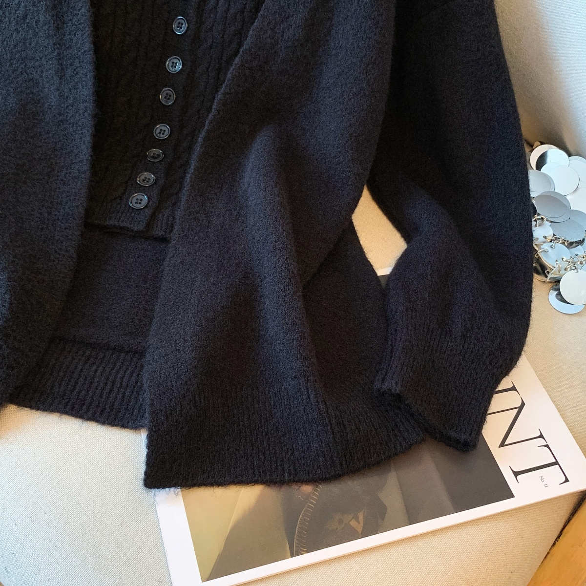 실사 2025 가을 겨울철 새로운 한국 스타일 인터넷 유명인 비스듬한 칼라 오프숄더 몸매 가꾸기 기본 셔츠 니트 스웨터 맨위