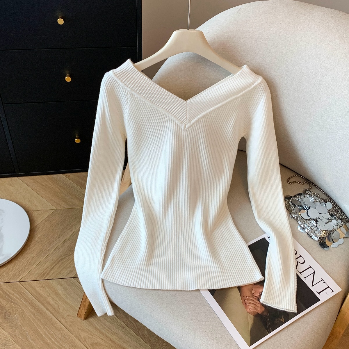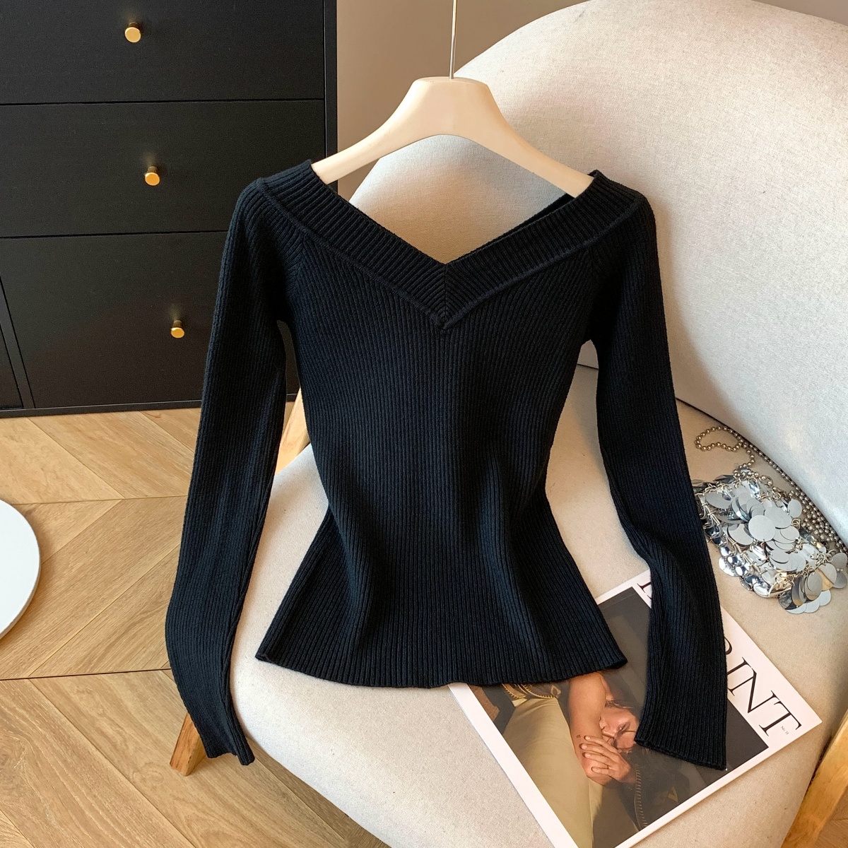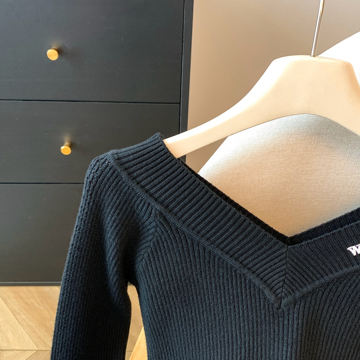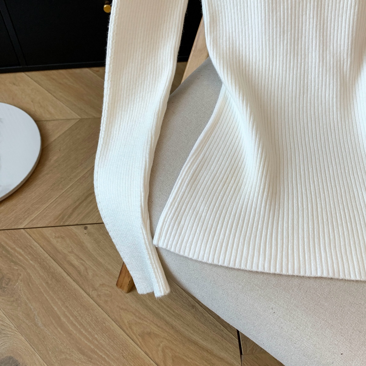 실사 2025 가을 겨울철 새로운 한국 스타일 인터넷 유명인 비스듬한 칼라 오프숄더 몸매 가꾸기 기본 셔츠 니트 스웨터 맨위