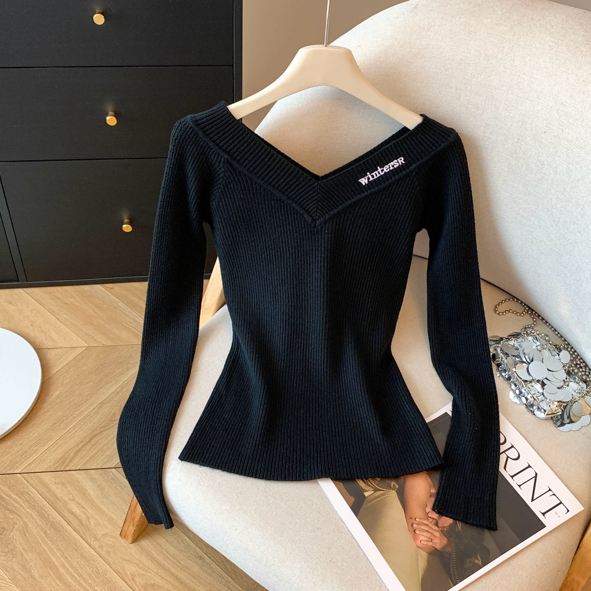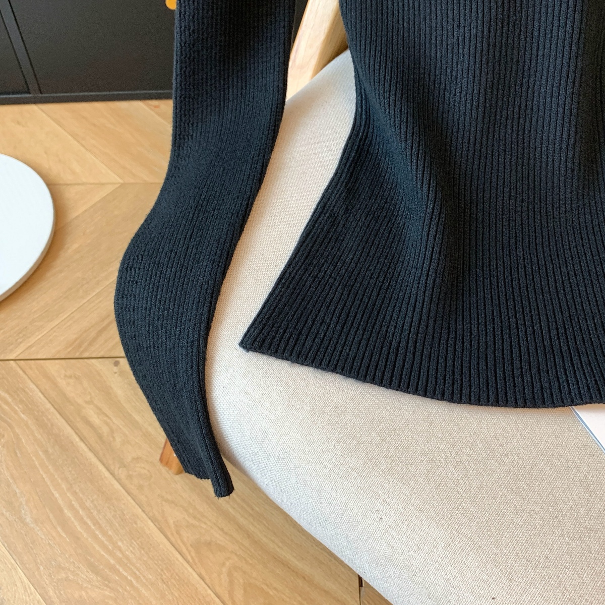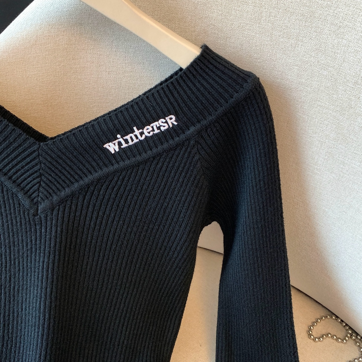 실사 2025 가을 겨울철 새로운 한국 스타일 인터넷 유명인 비스듬한 칼라 오프숄더 몸매 가꾸기 기본 셔츠 니트 스웨터 맨위