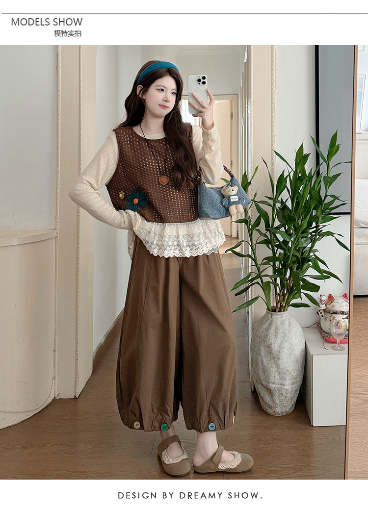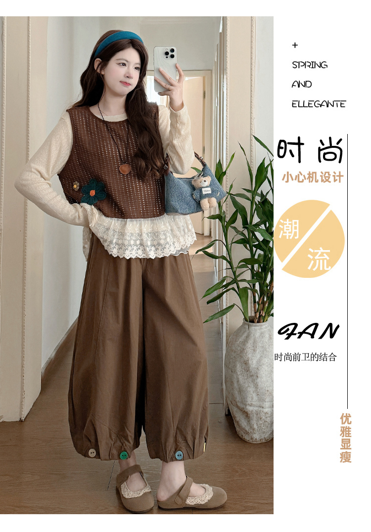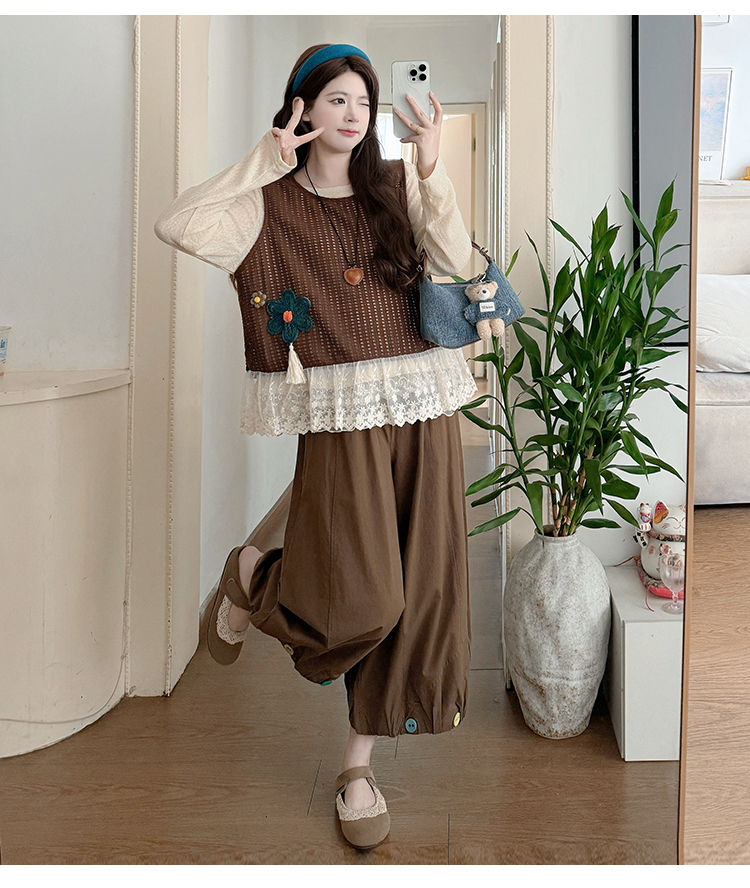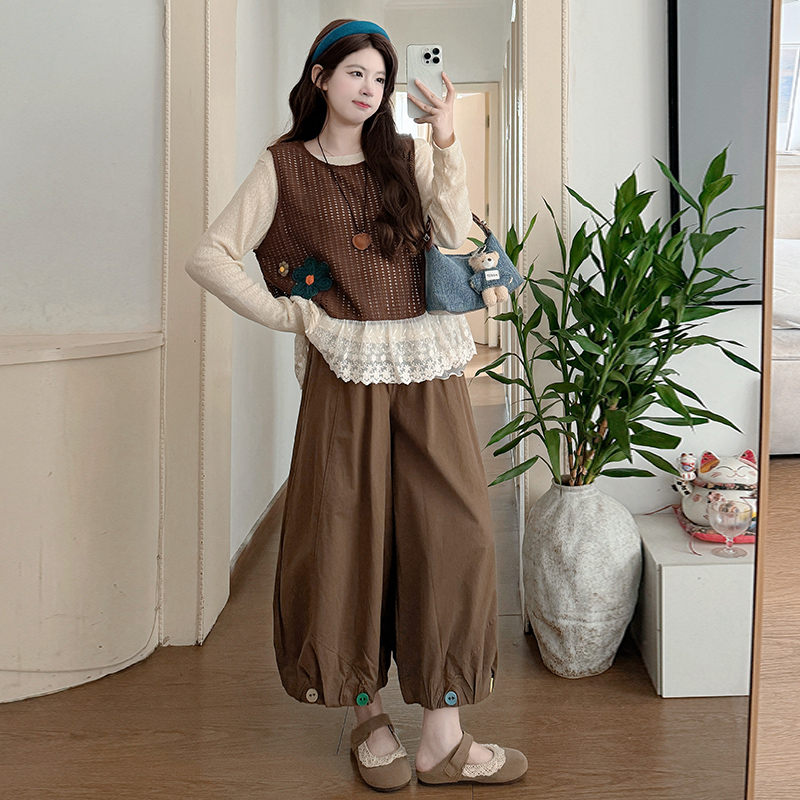 실사 xian 물품 봄 한국 스타일 패치워크 레이스 맨위 홀로우 아웃 베스트 와이드 레그 팬츠 돼지 코 버클 3종 세트