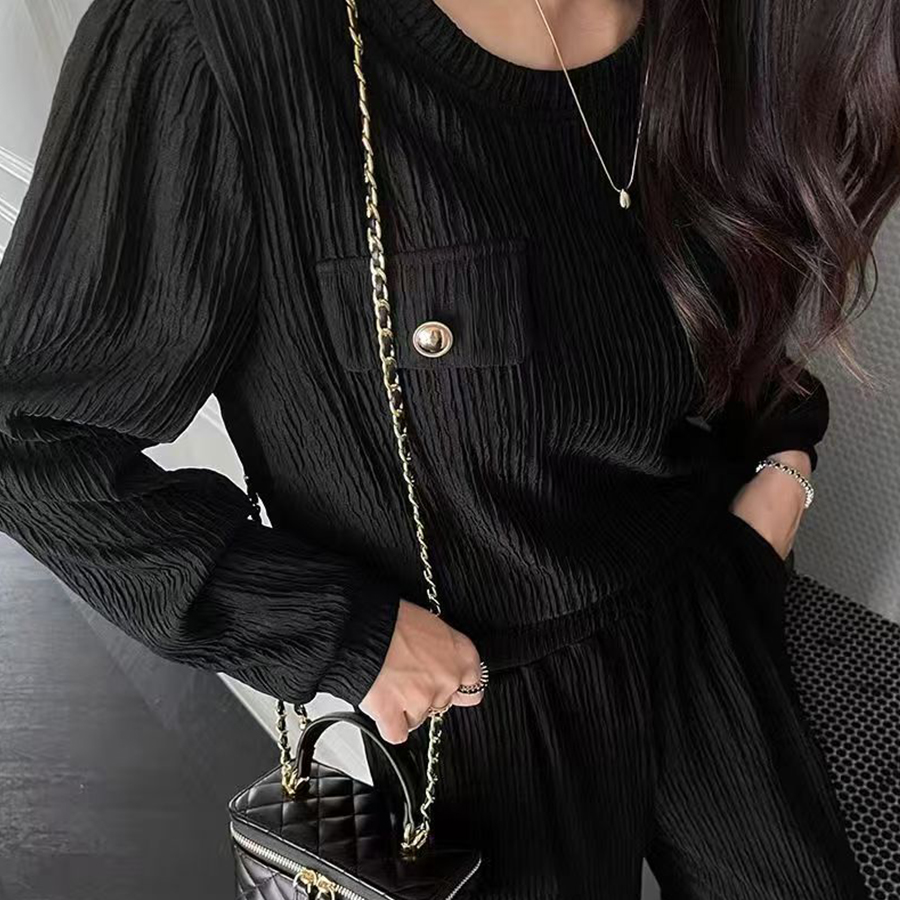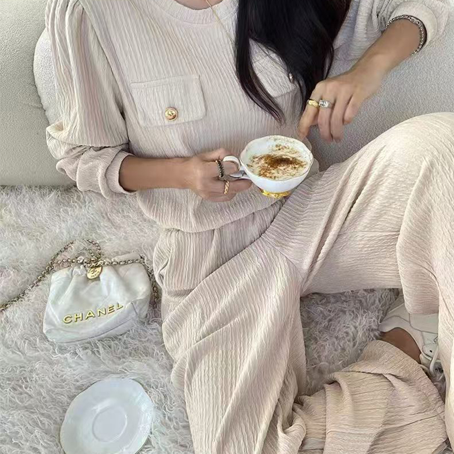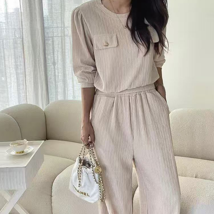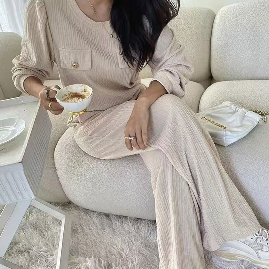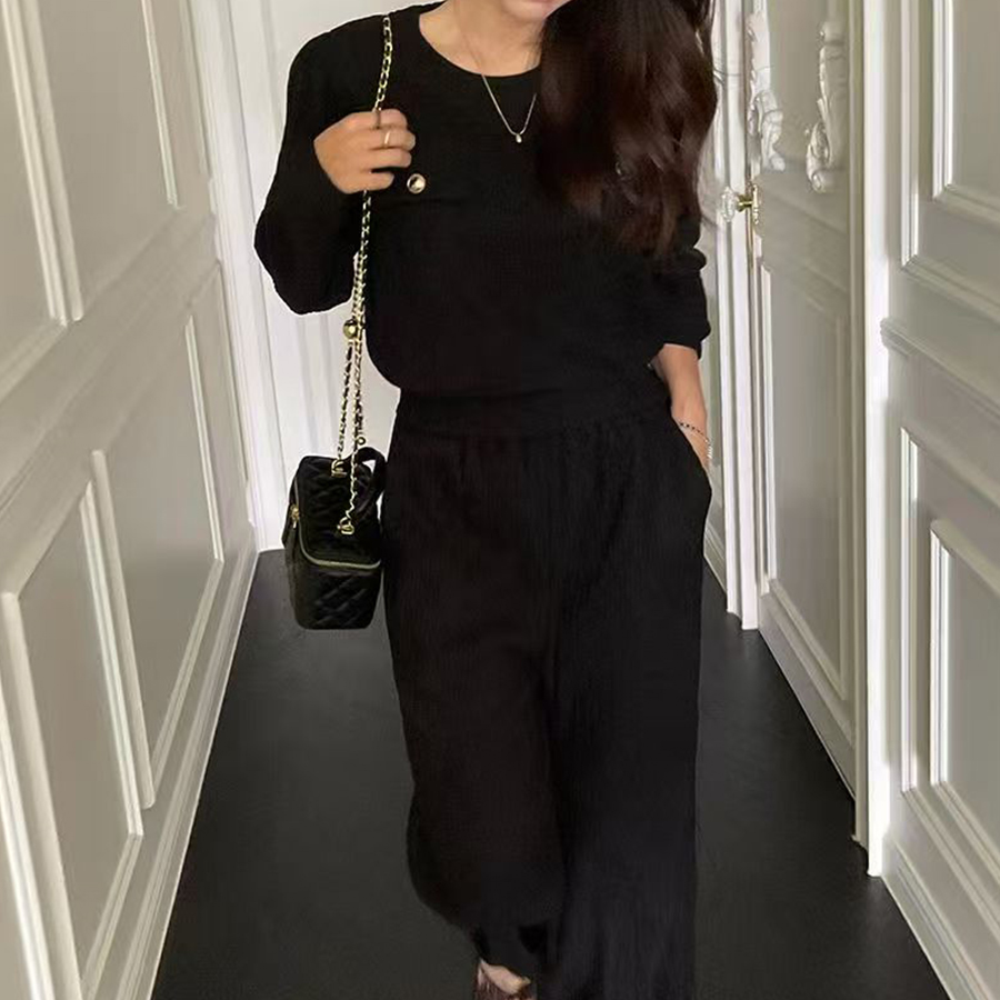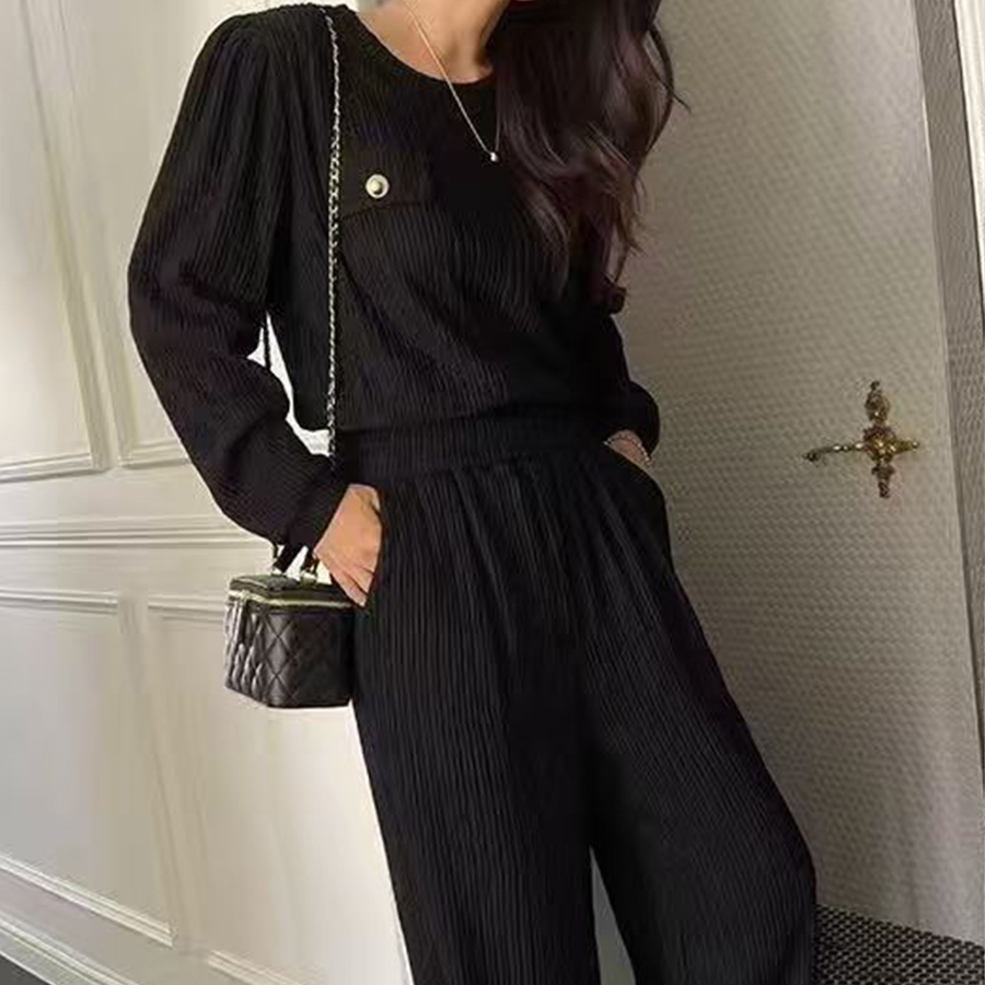 질감 센스 패션 세트 품격 하이웨이스트 캐주얼 긴 바지 우아함 작은 샤넬 스타일 라운드 넥 풀오버 긴팔 투피스 세트