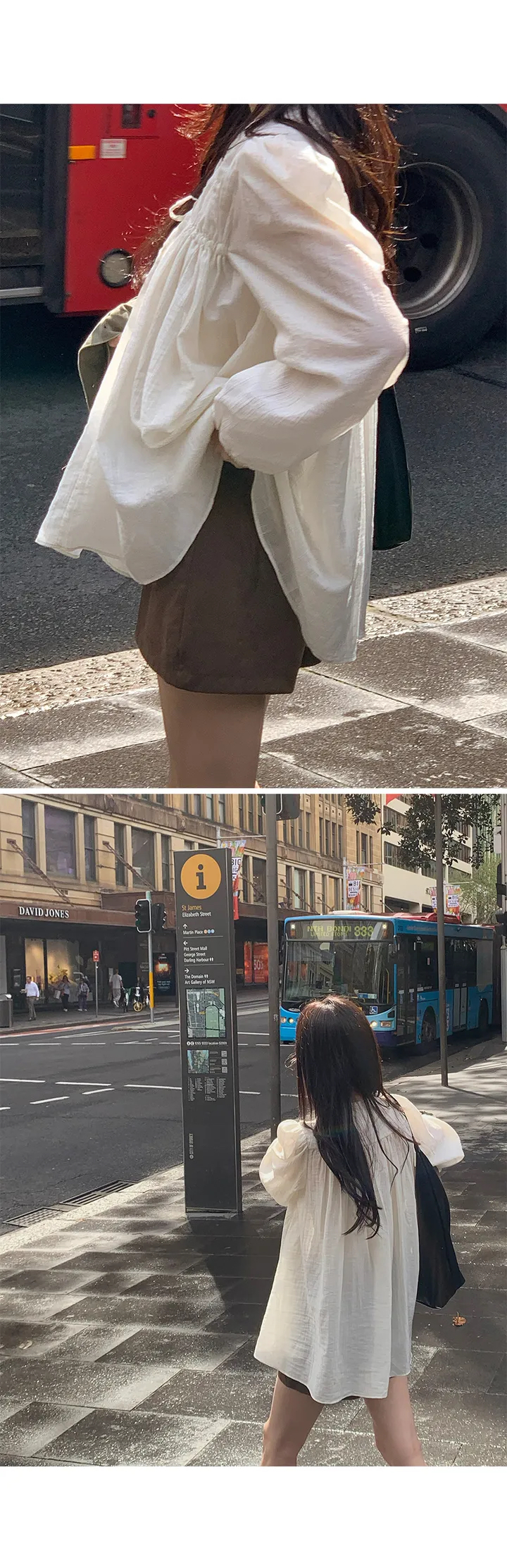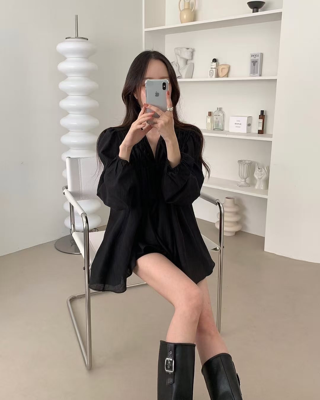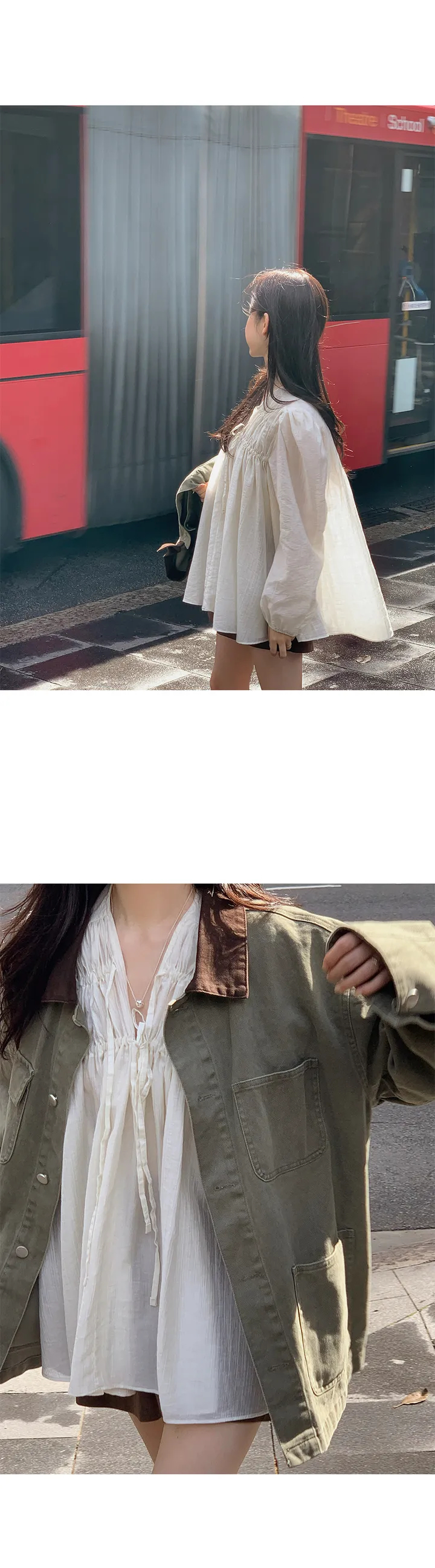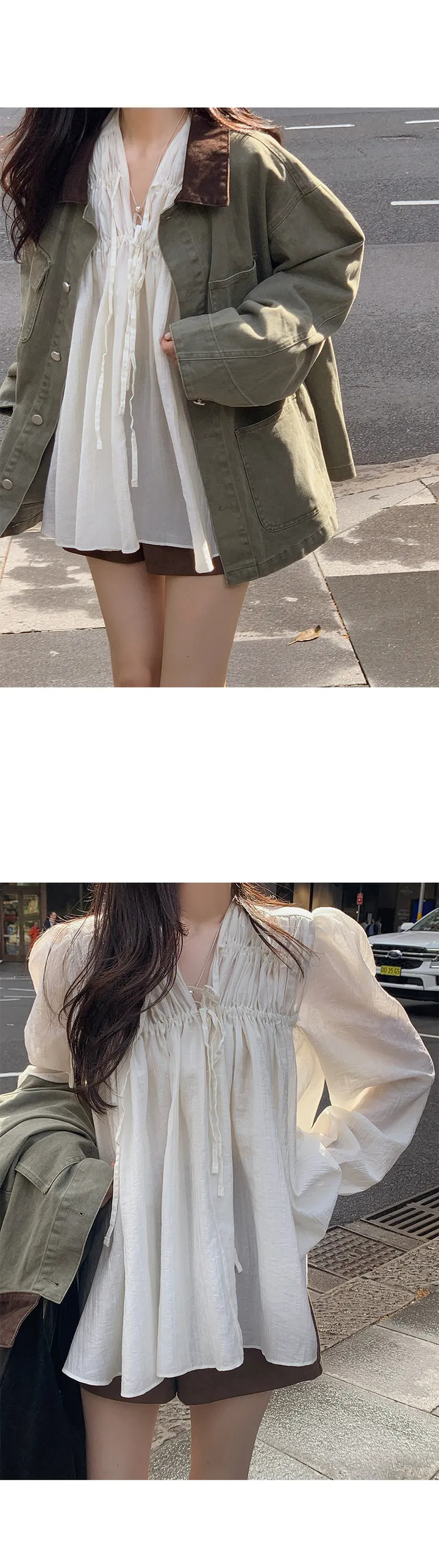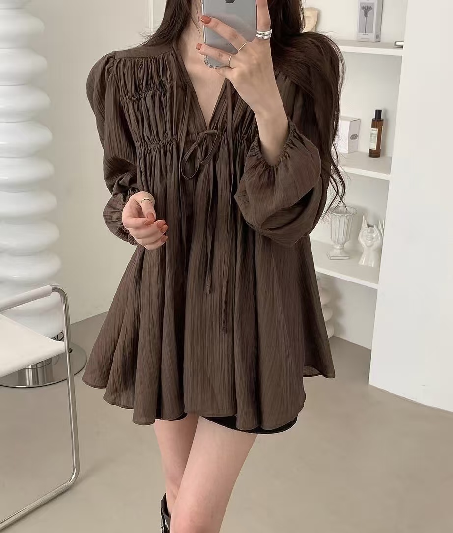 있음 선적 한국 ins 레이스업 V넥 주름 단색 거품 소매 셔츠 쉬폰 블라우스