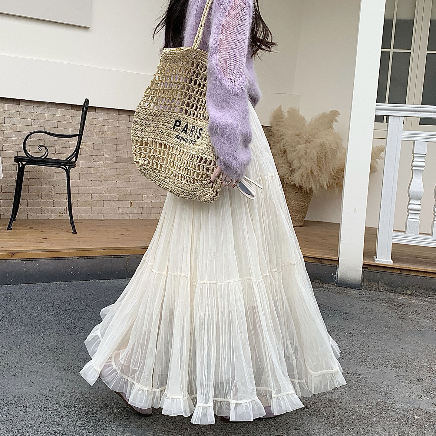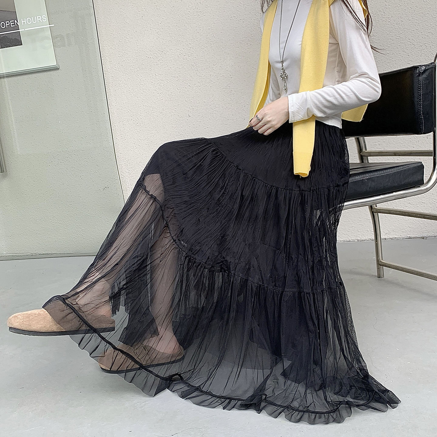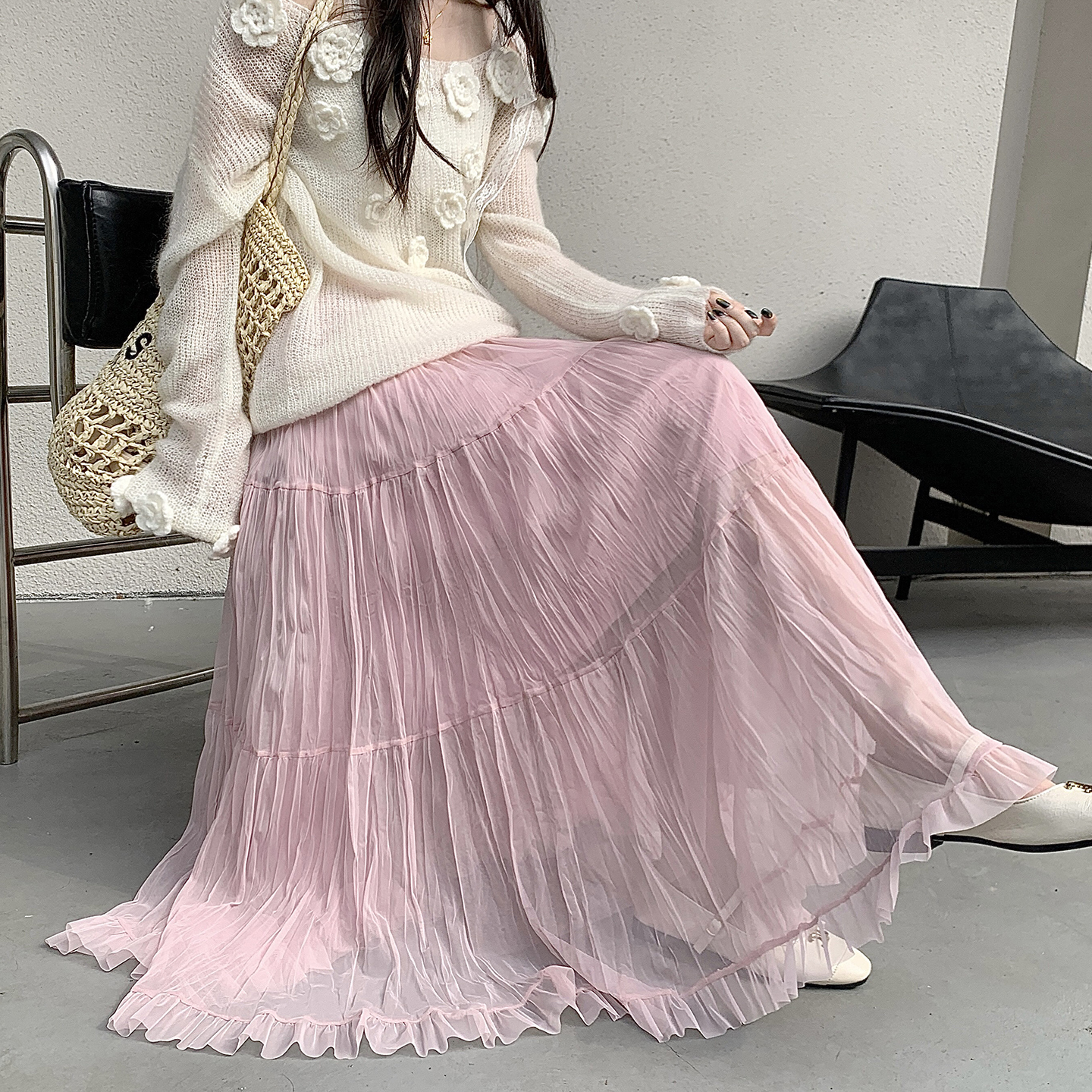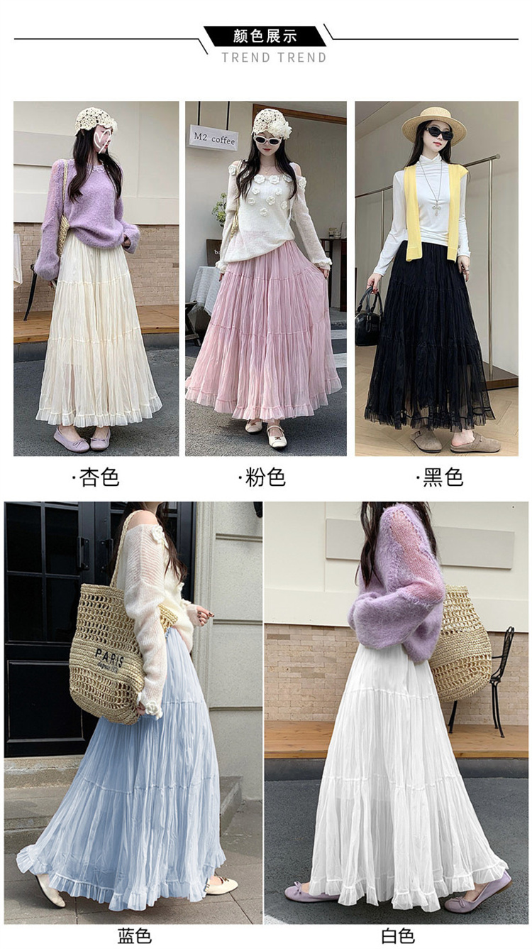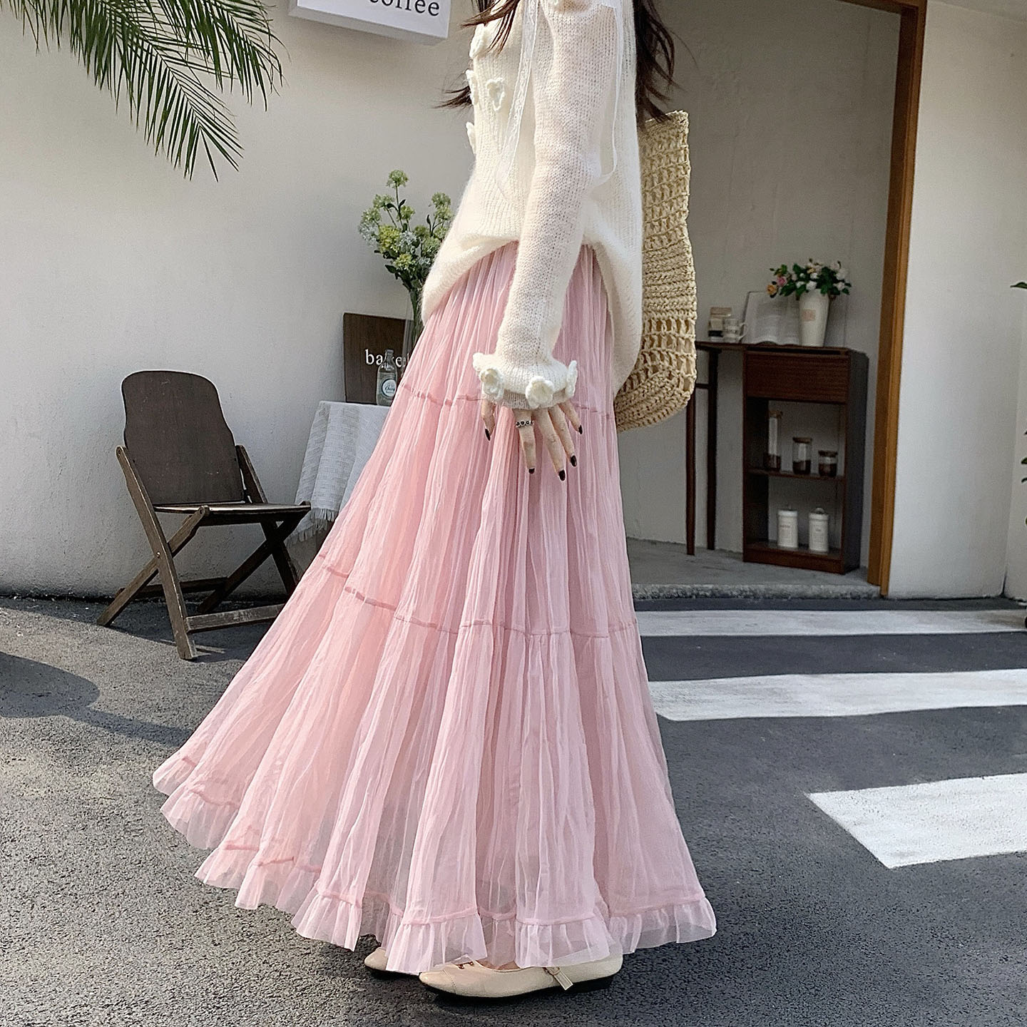 슈퍼 요정 망사 한 마디 플리츠 롱 스커트 여성 2026 봄 여름 새로운 휴가 바람 슬림해 보이는 표지 십자가 단색 반신 스커트