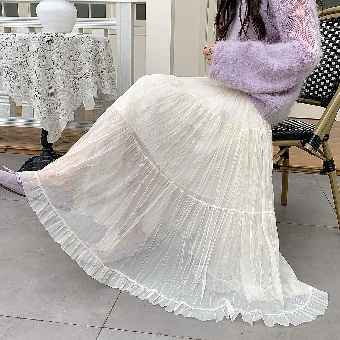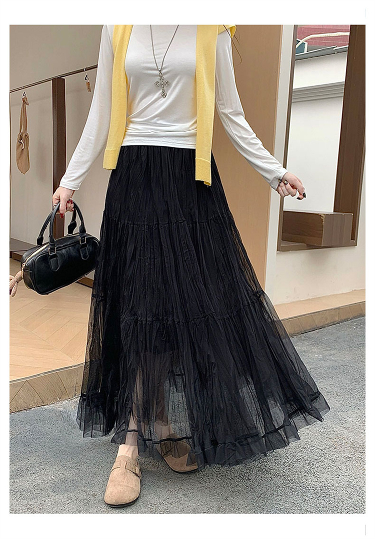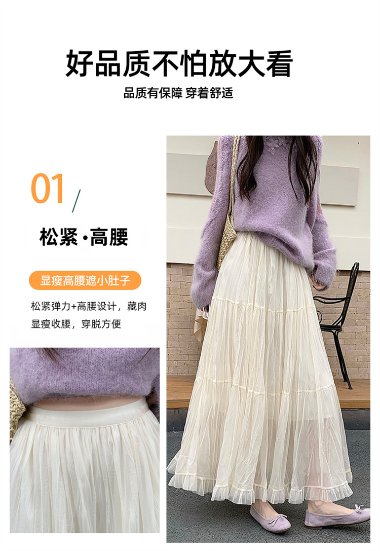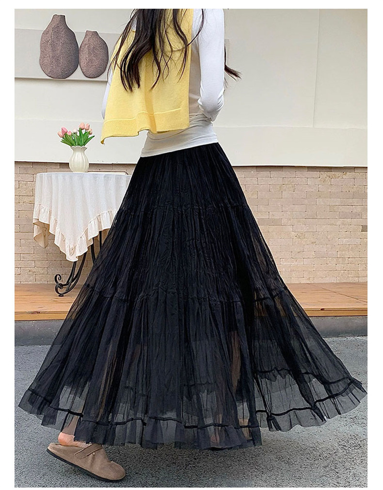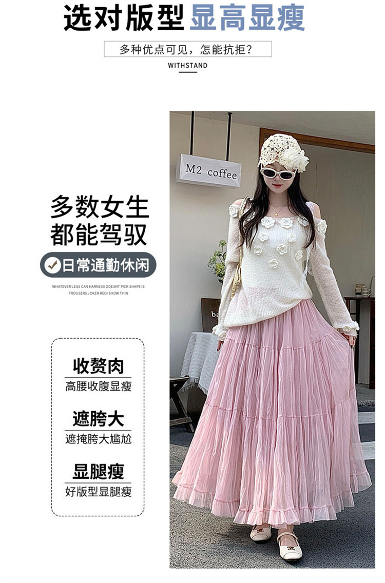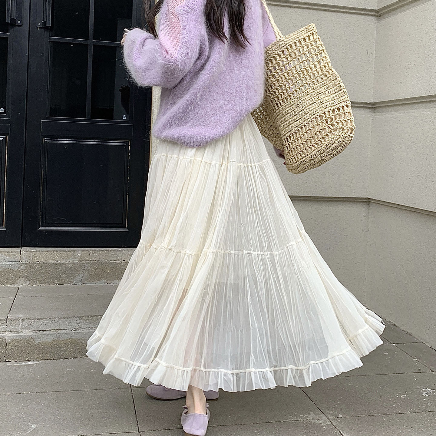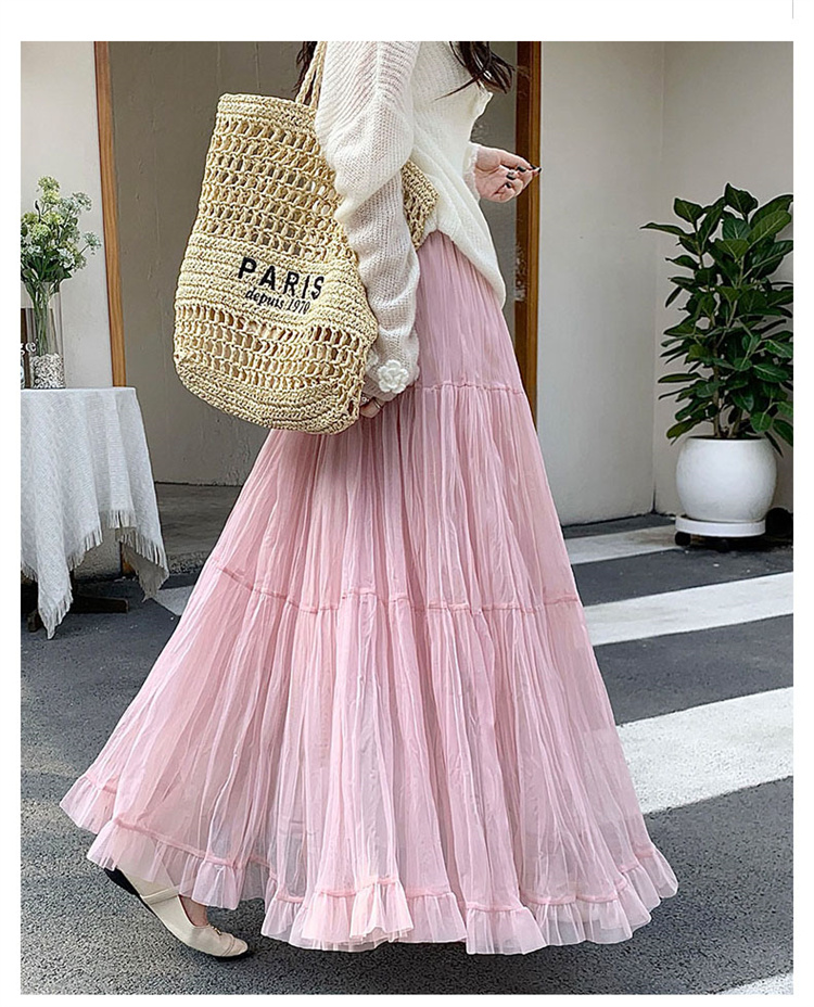 슈퍼 요정 망사 한 마디 플리츠 롱 스커트 여성 2026 봄 여름 새로운 휴가 바람 슬림해 보이는 표지 십자가 단색 반신 스커트