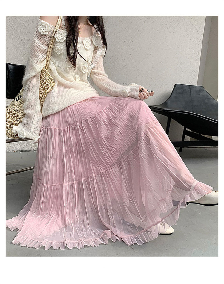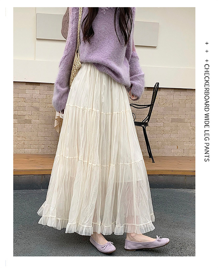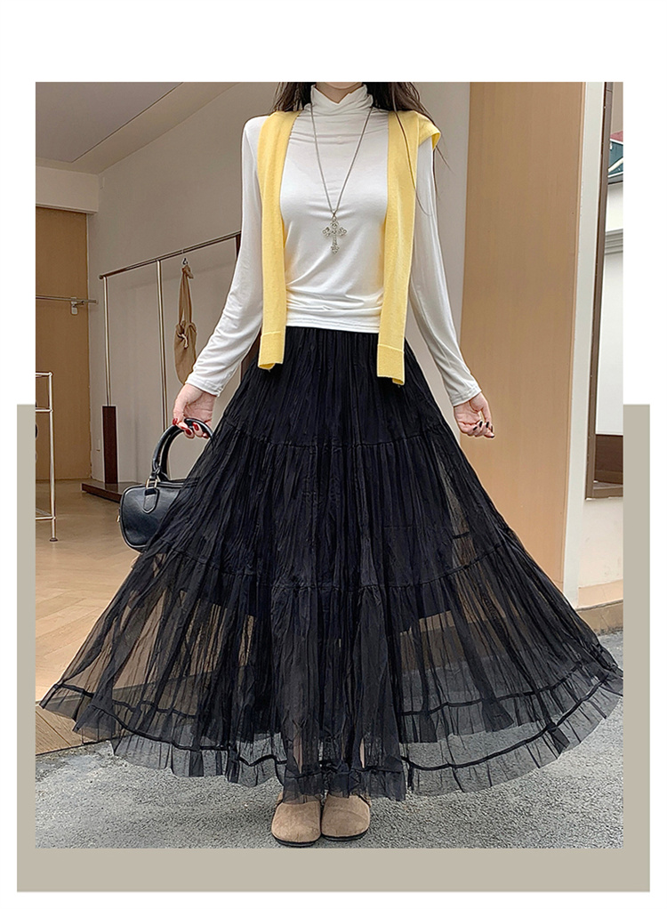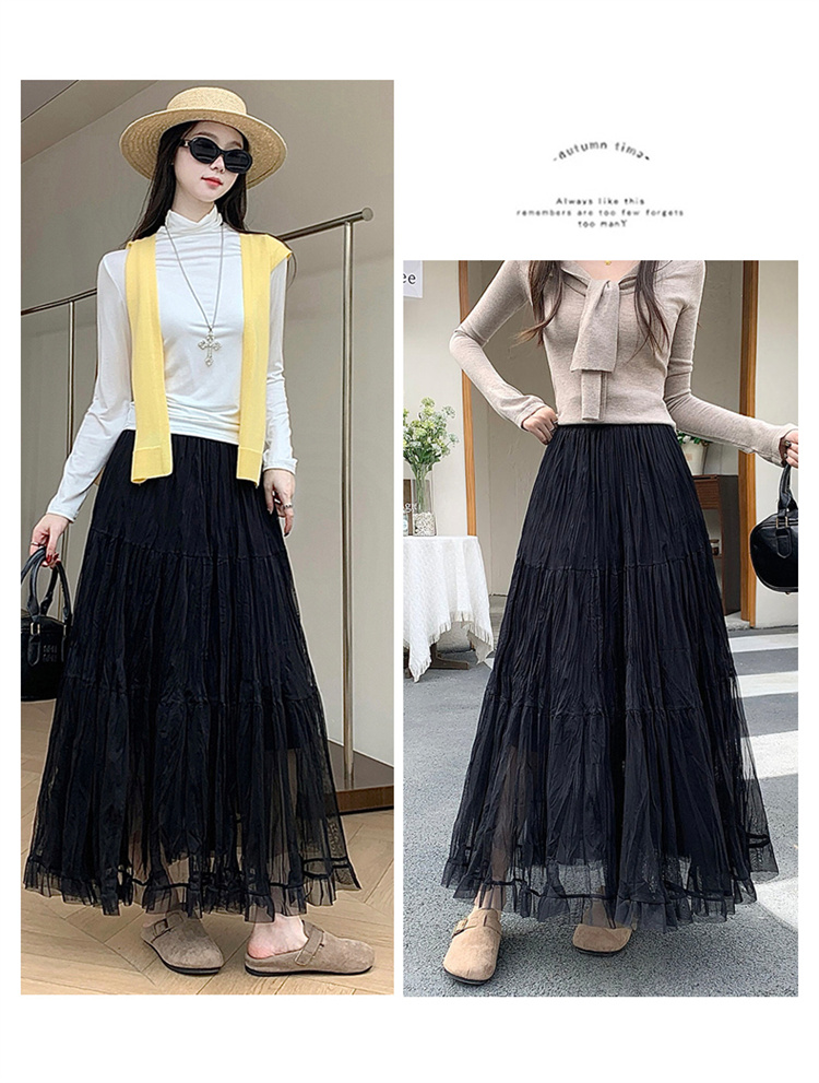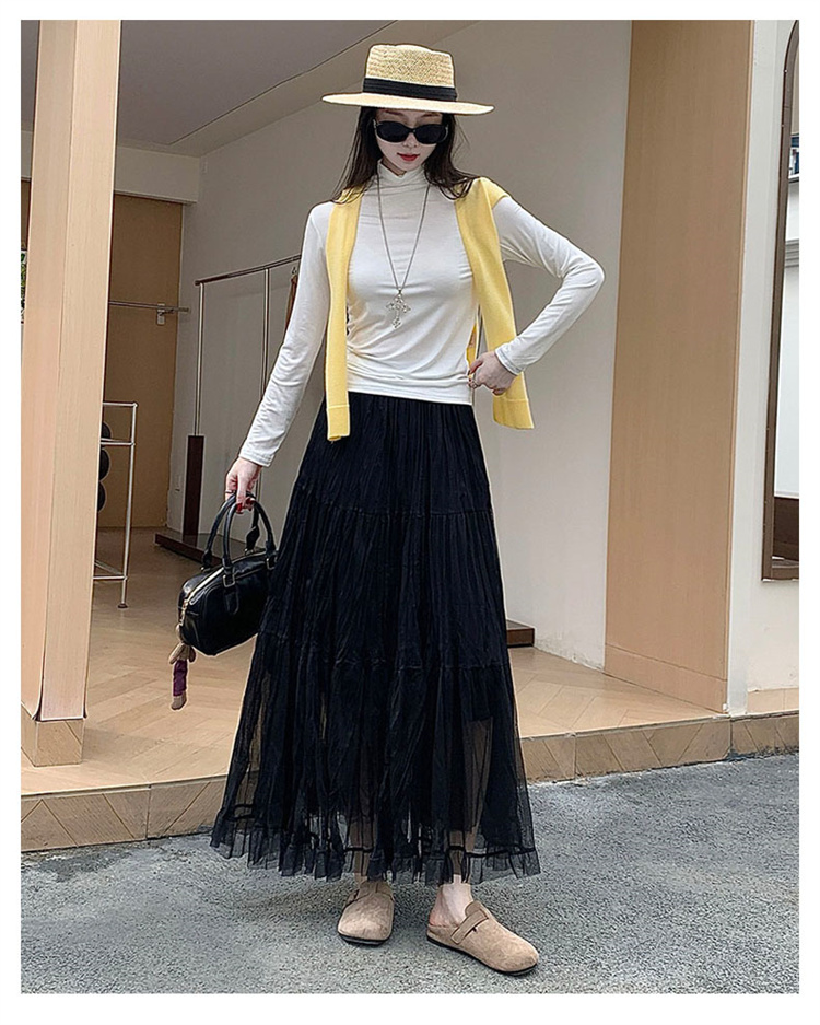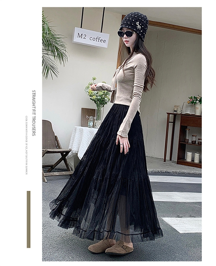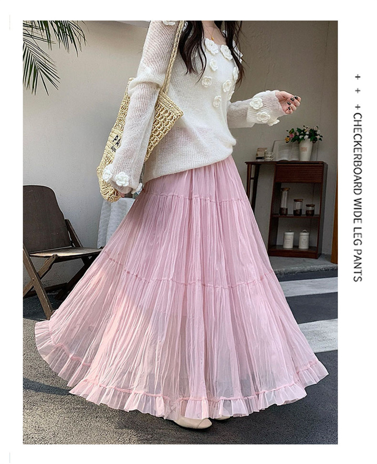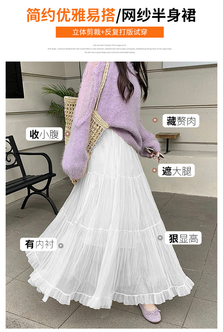 슈퍼 요정 망사 한 마디 플리츠 롱 스커트 여성 2026 봄 여름 새로운 휴가 바람 슬림해 보이는 표지 십자가 단색 반신 스커트
