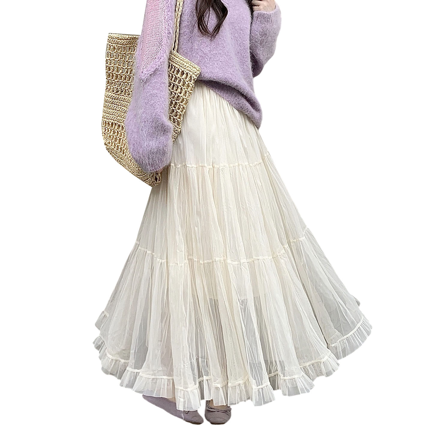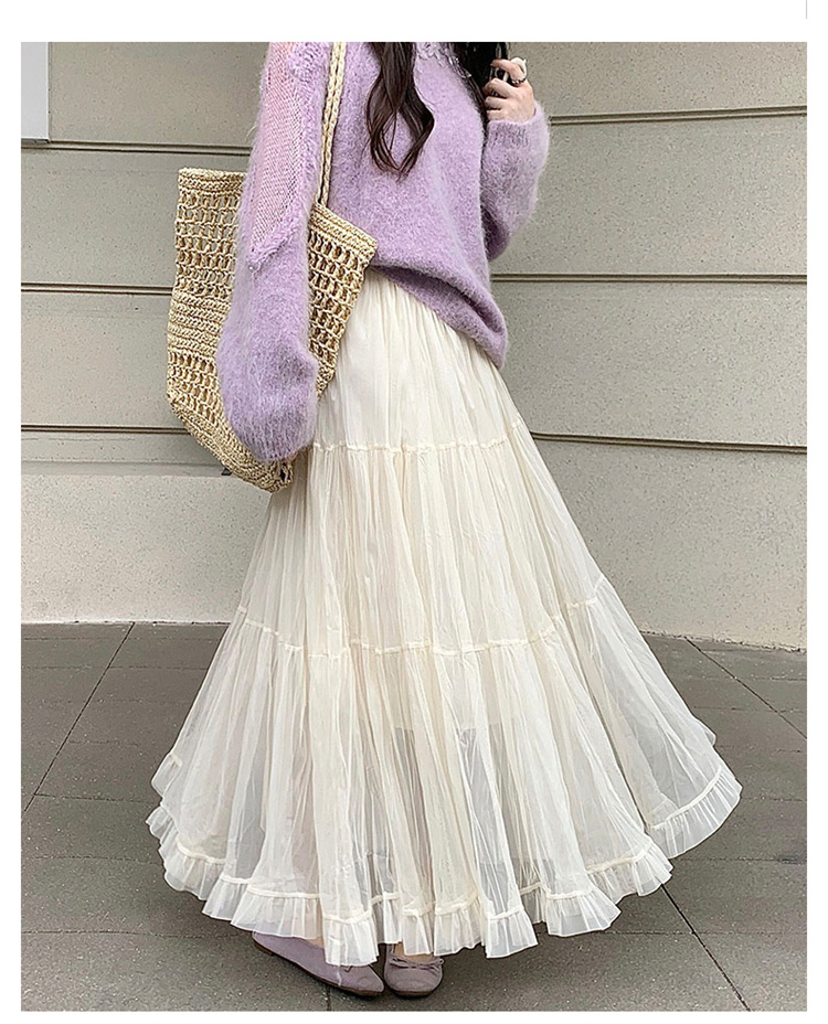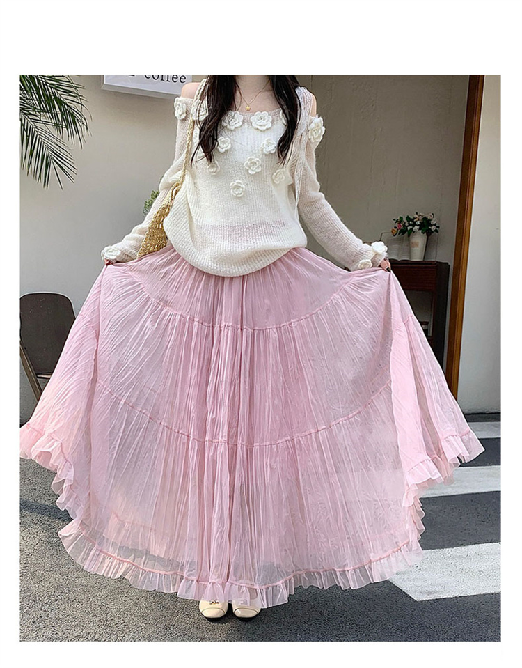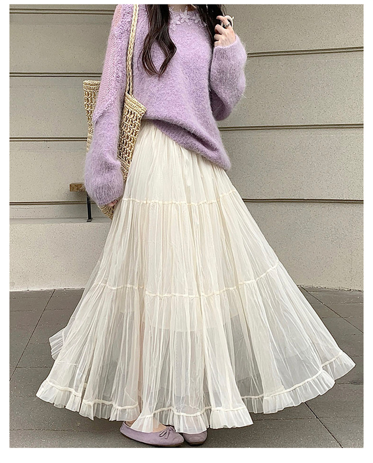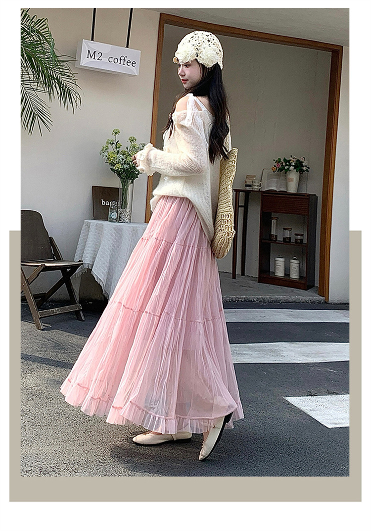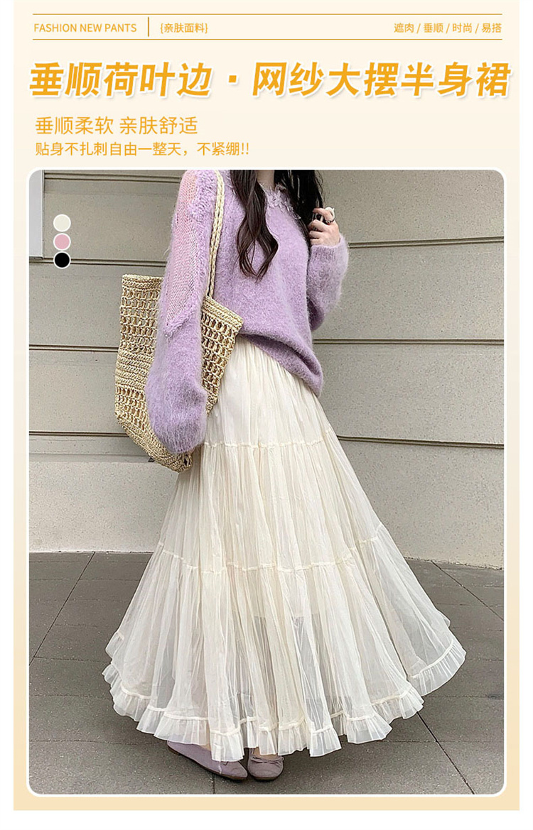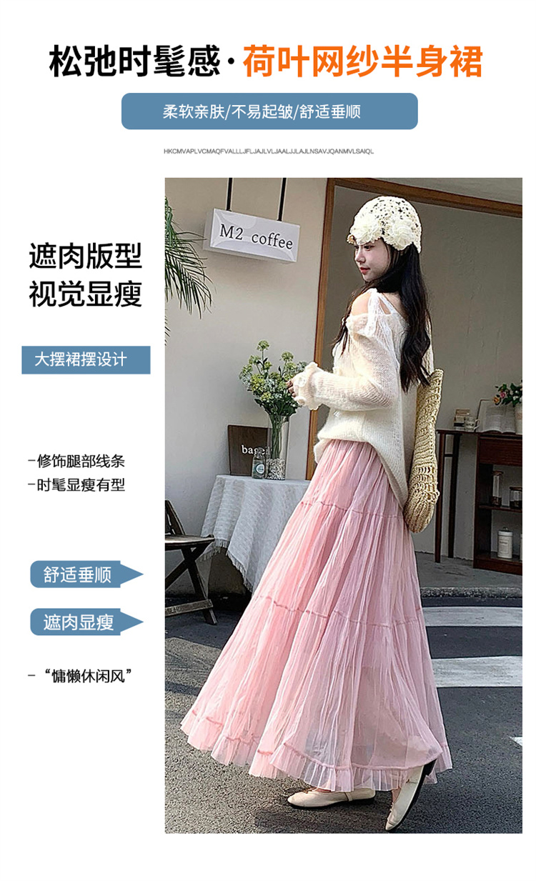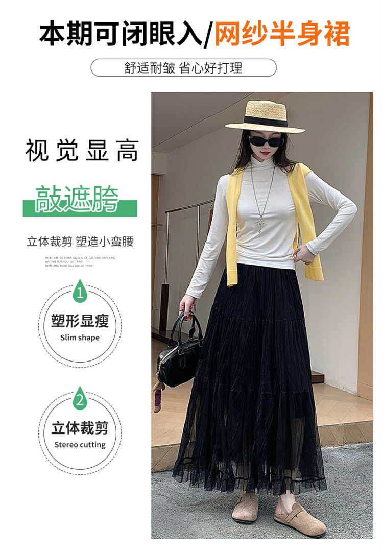 슈퍼 요정 망사 한 마디 플리츠 롱 스커트 여성 2026 봄 여름 새로운 휴가 바람 슬림해 보이는 표지 십자가 단색 반신 스커트