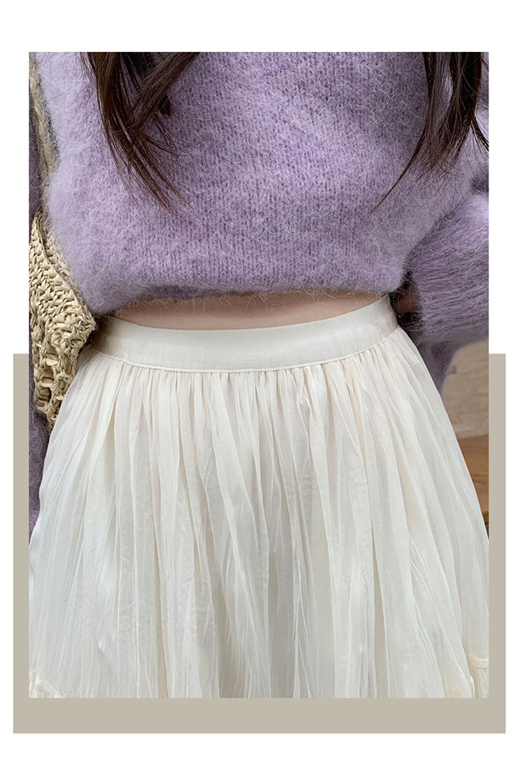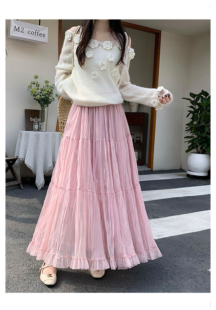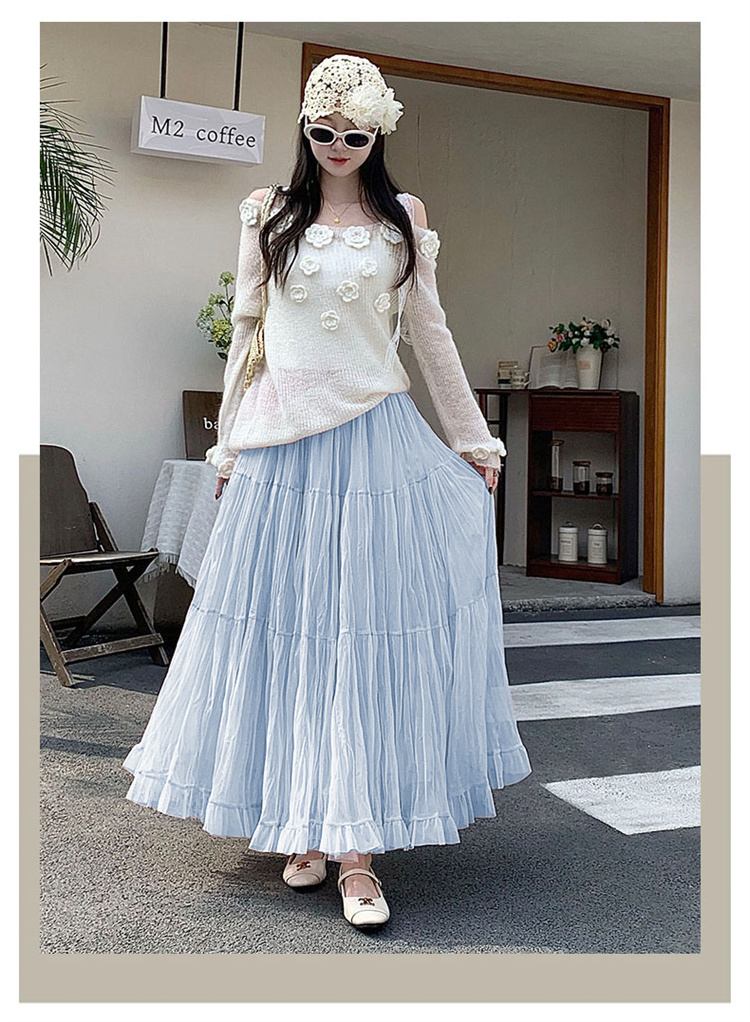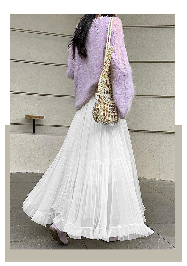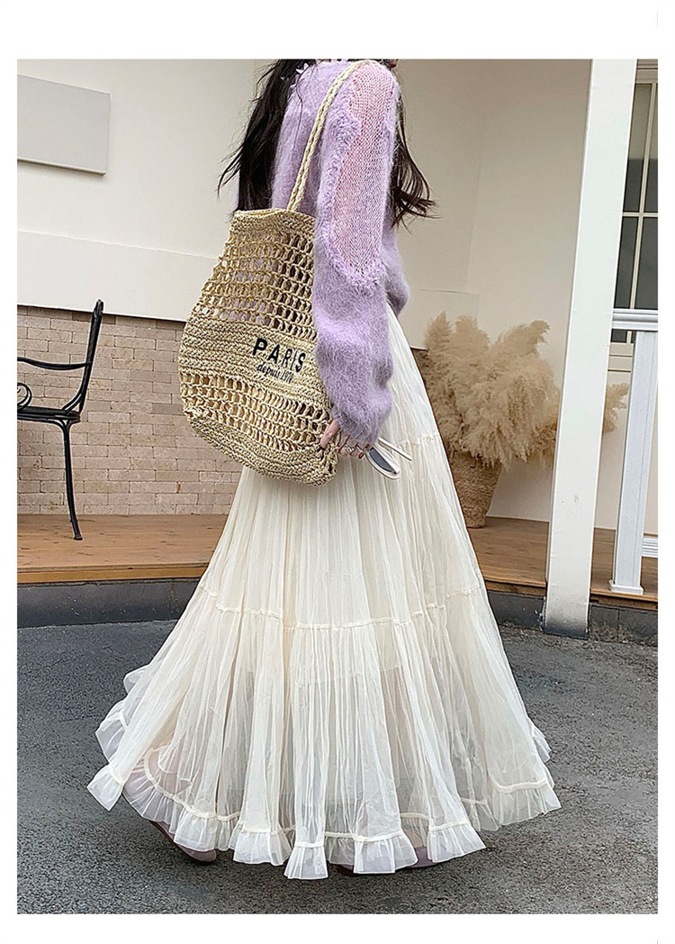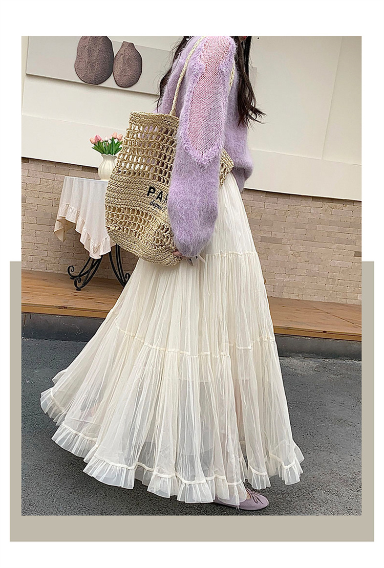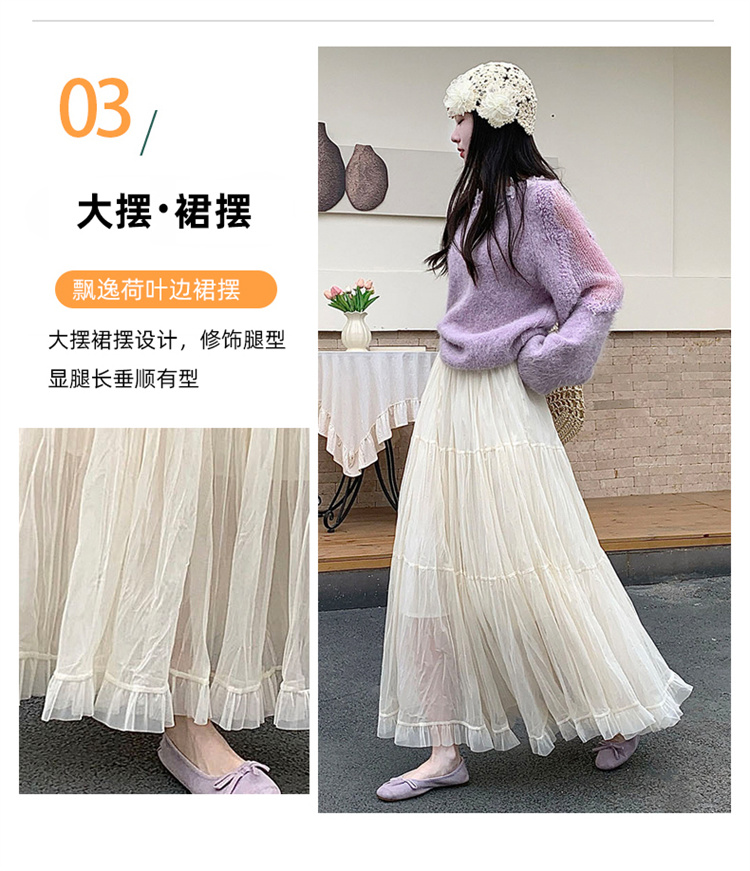 슈퍼 요정 망사 한 마디 플리츠 롱 스커트 여성 2026 봄 여름 새로운 휴가 바람 슬림해 보이는 표지 십자가 단색 반신 스커트