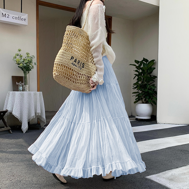 빛 럭셔리 도루 가을 센스 플리츠 쉬폰 반신 스커트 여성 여름 큰 진자 하이웨이스트 슬림해 보이는 한 마디 표지 넓적 다리 플리츠 롱 스커트