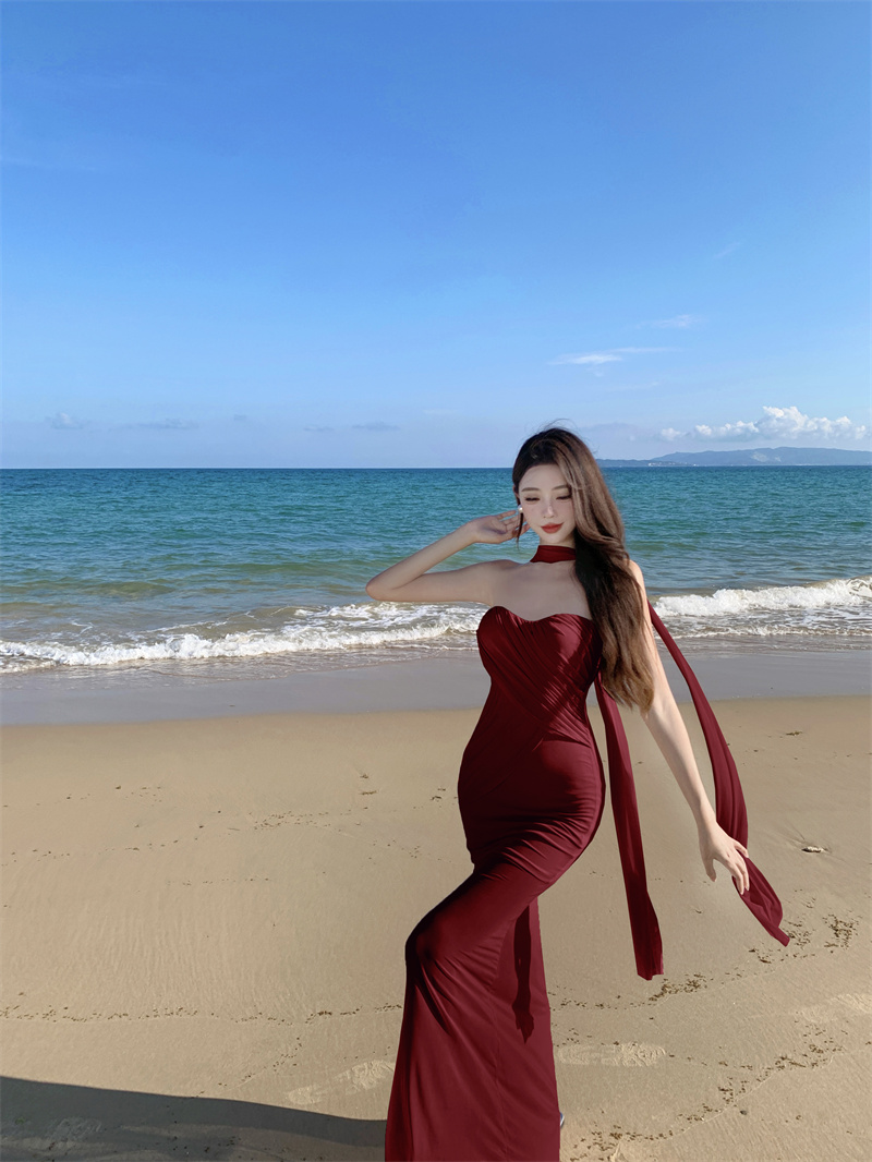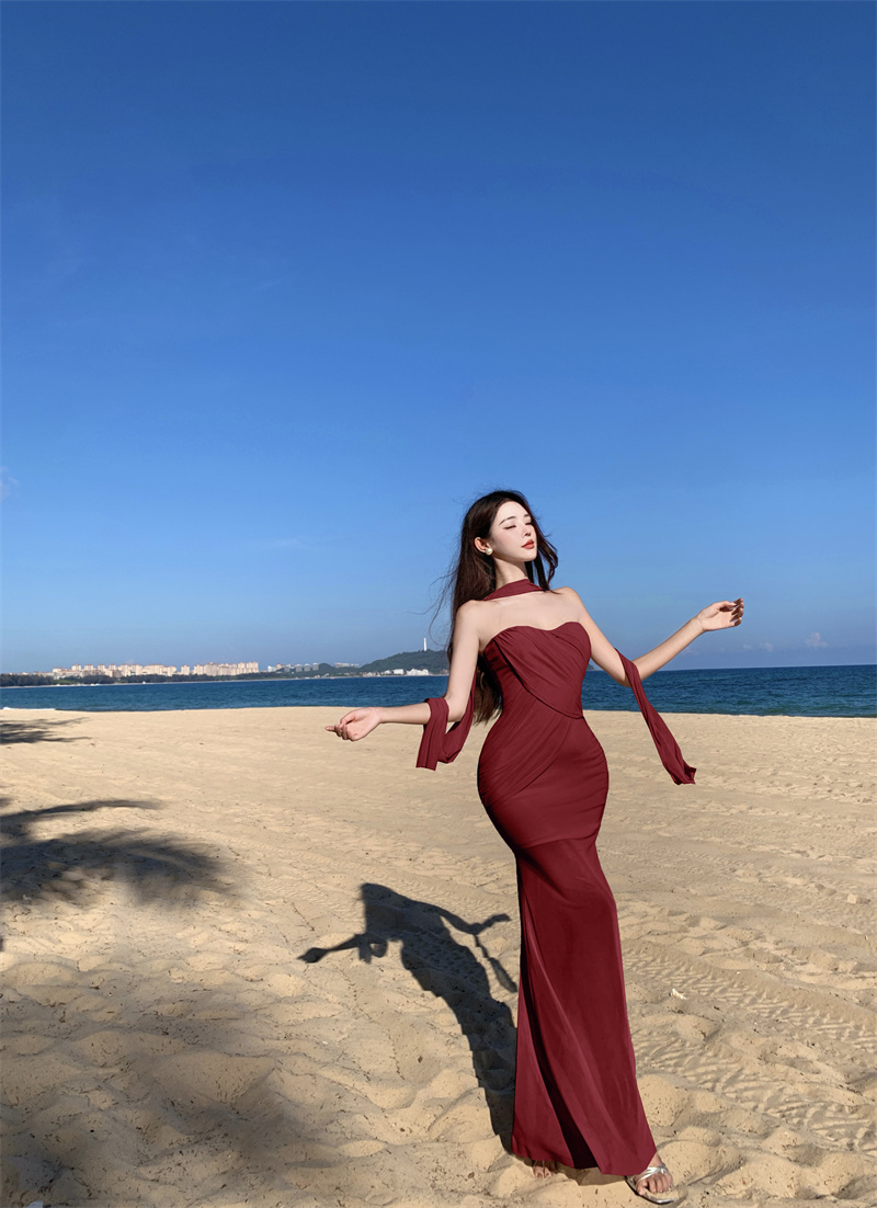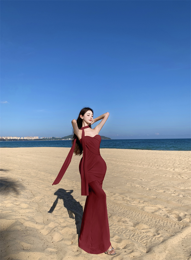 빨간색 롱 코트 V넥 오프숄더 허리 수축 행침 목 슬립 여성 드레스 여름 프랑스식 품격 섹시함 치마