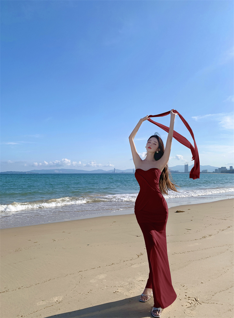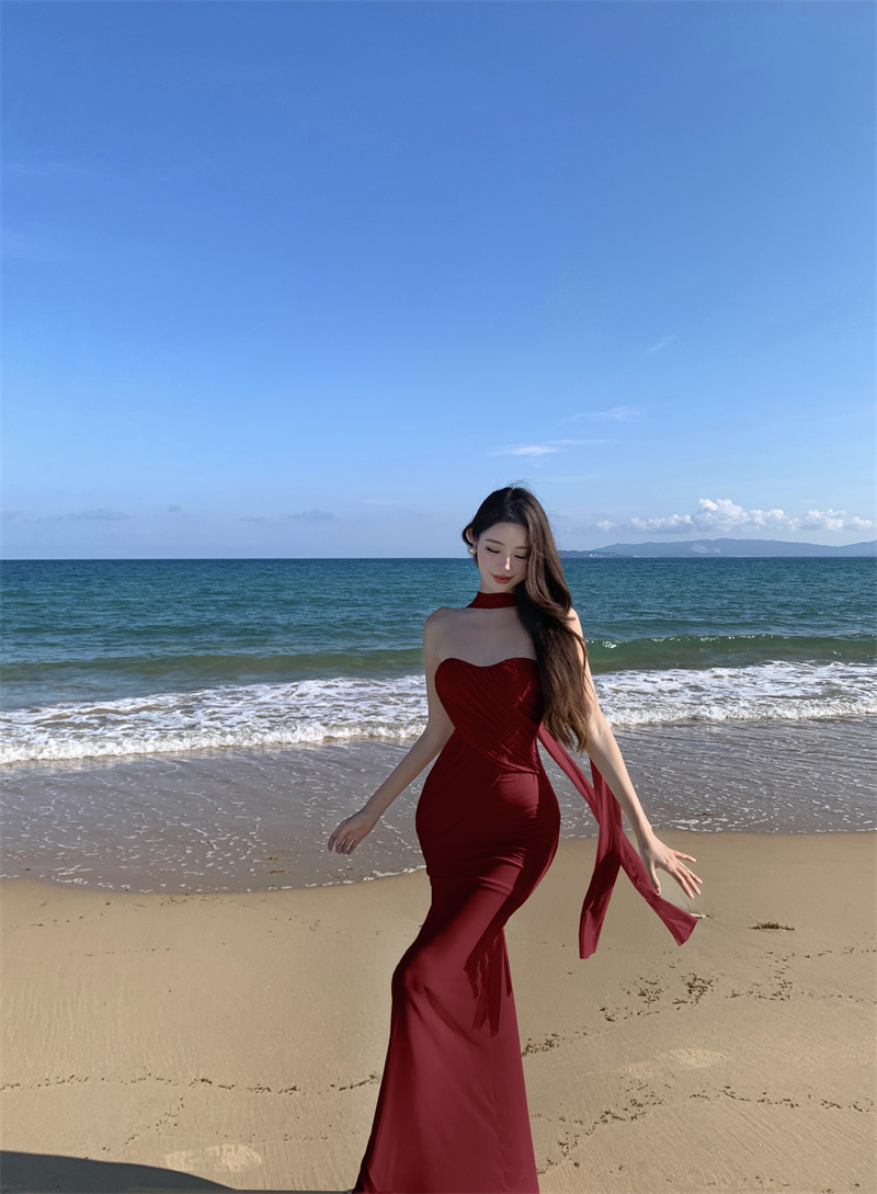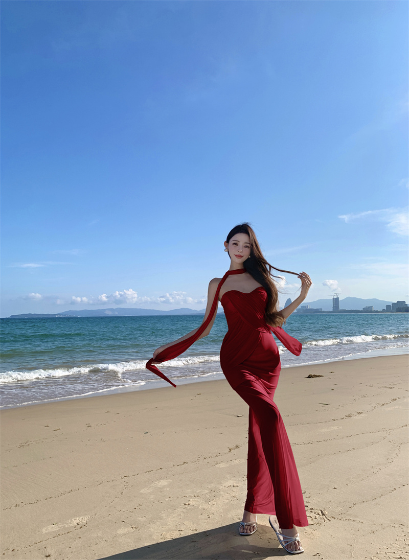 프랑스식 레트로 빨간색 V넥 슬립 드레스 아름다운 루즈핏 휴가 해변 드레스 섹시함 백리스 케이크 롱 스커트