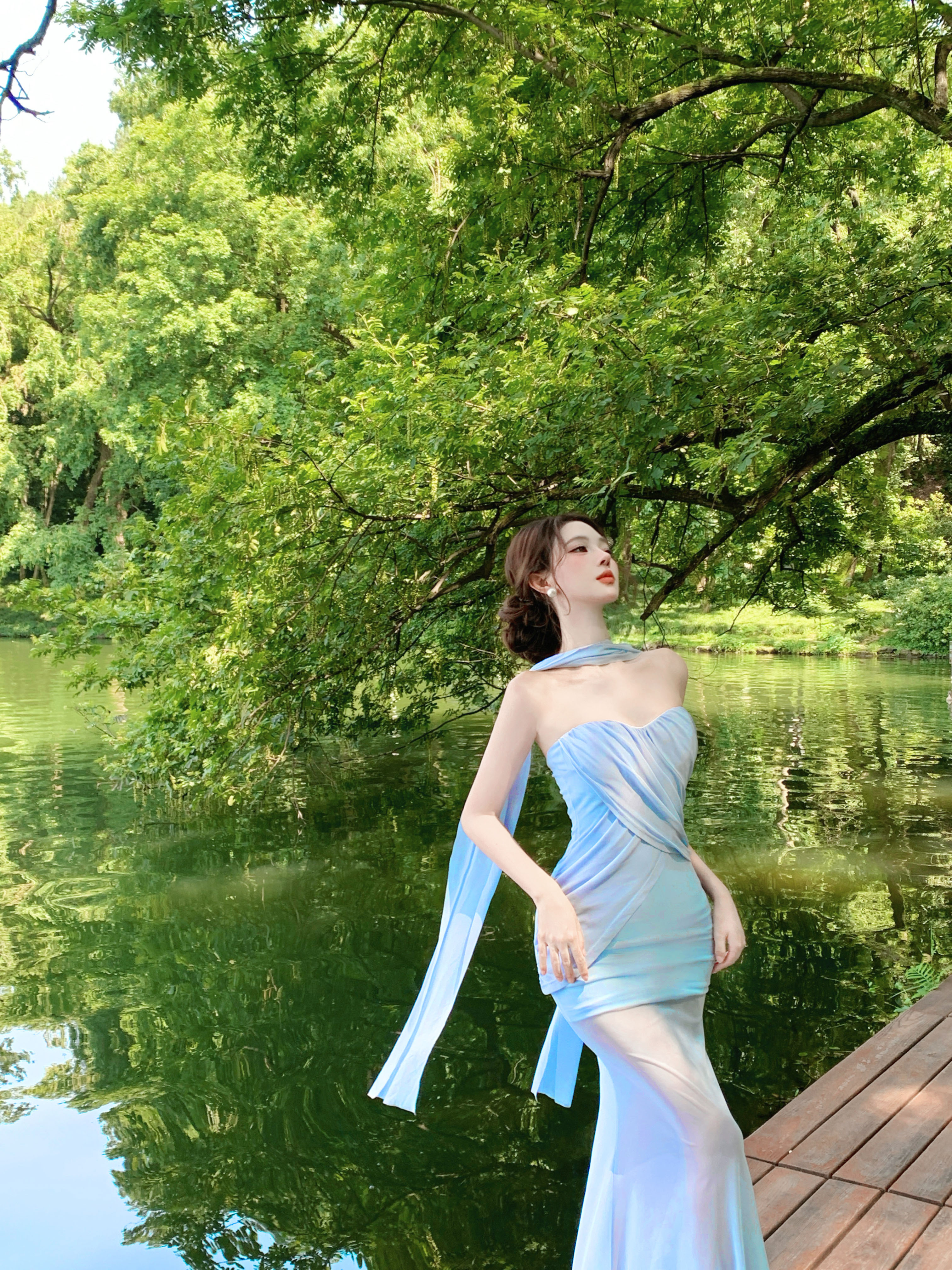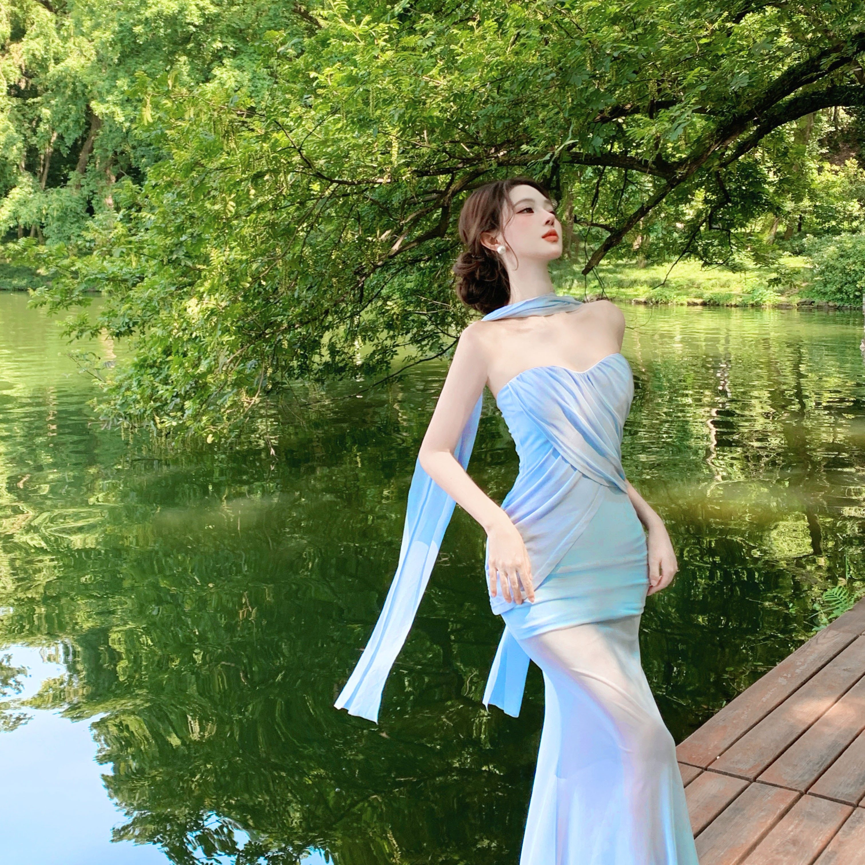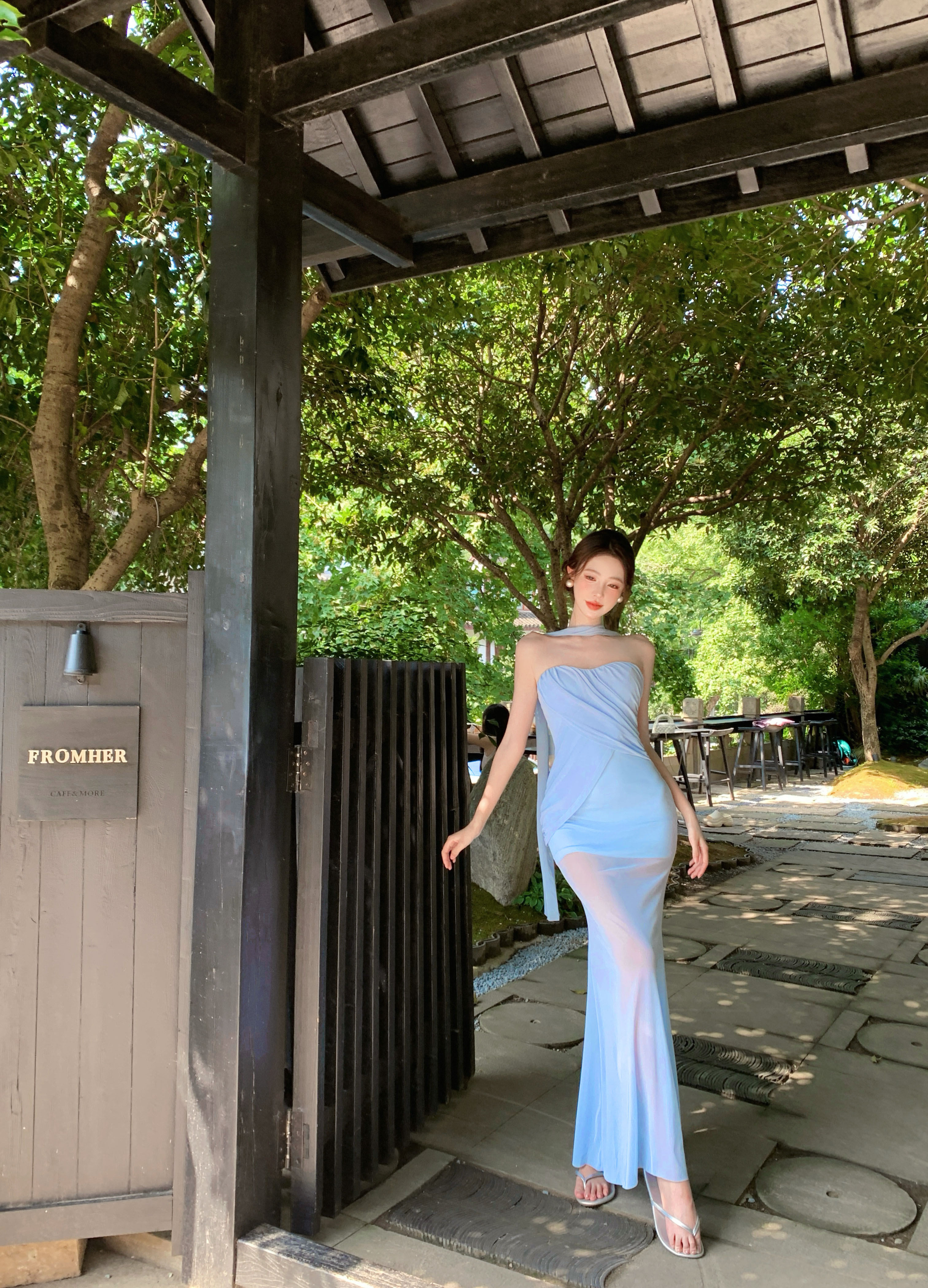 레이스 조각 민소매 행침 목 여성 드레스 여름 트임 허리 수축 인어 꼬리 치마 순수한 욕망 몸매 가꾸기 타이트 스커트 롱 스커트