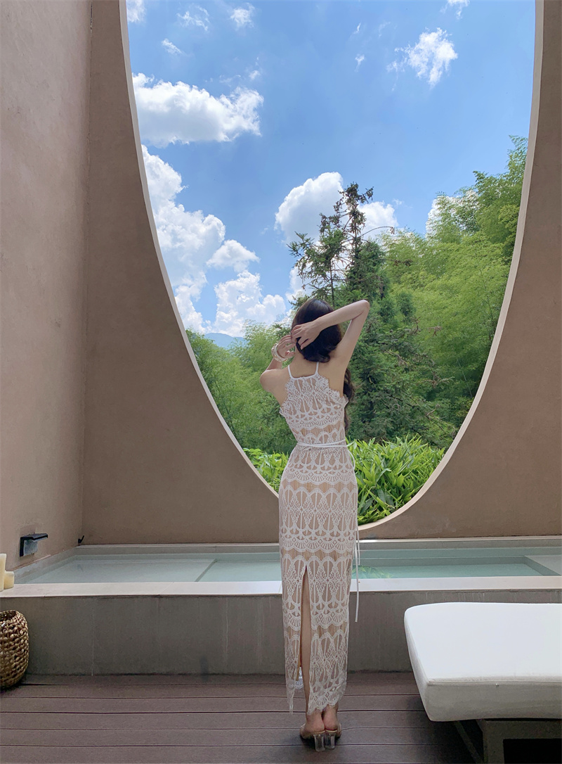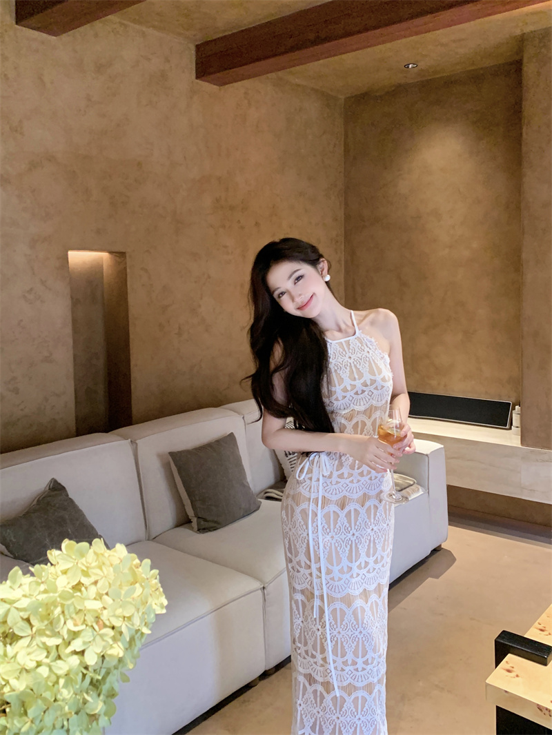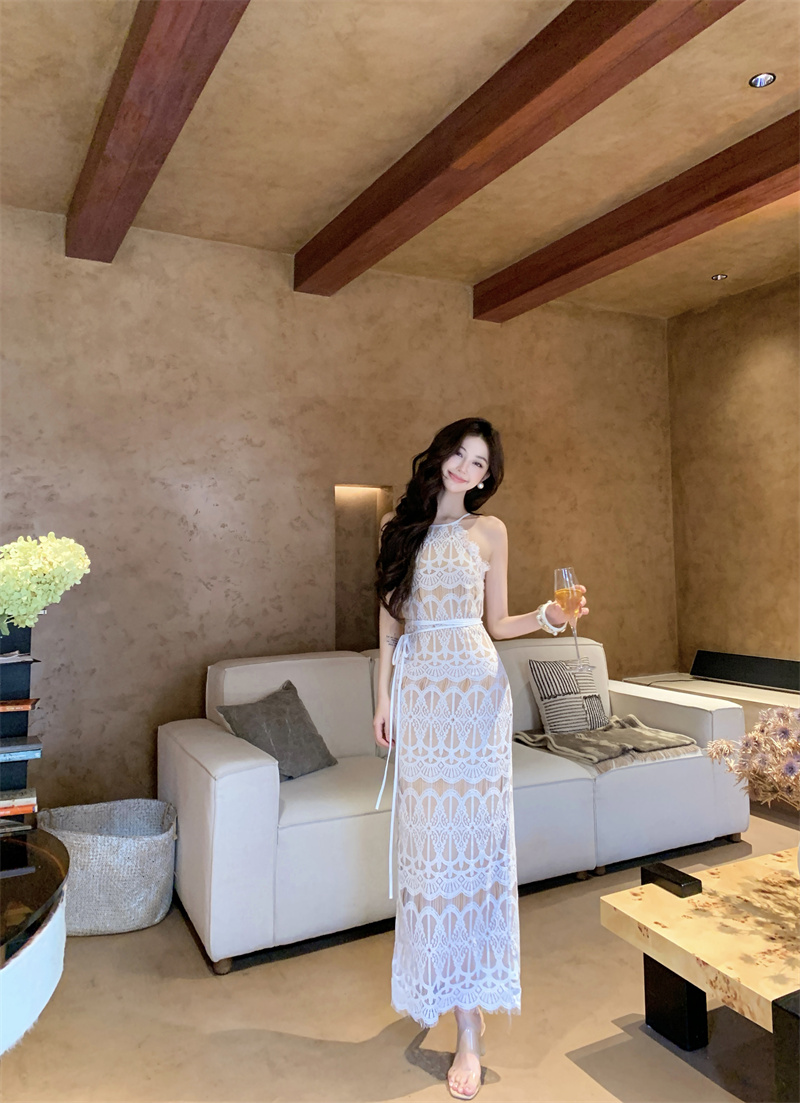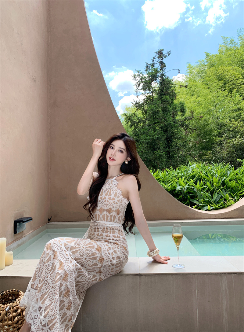 레이스 조각 민소매 행침 목 여성 드레스 여름 트임 허리 수축 인어 꼬리 치마 순수한 욕망 몸매 가꾸기 타이트 스커트 롱 스커트