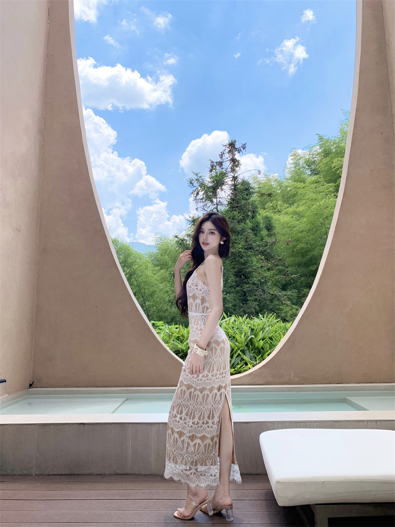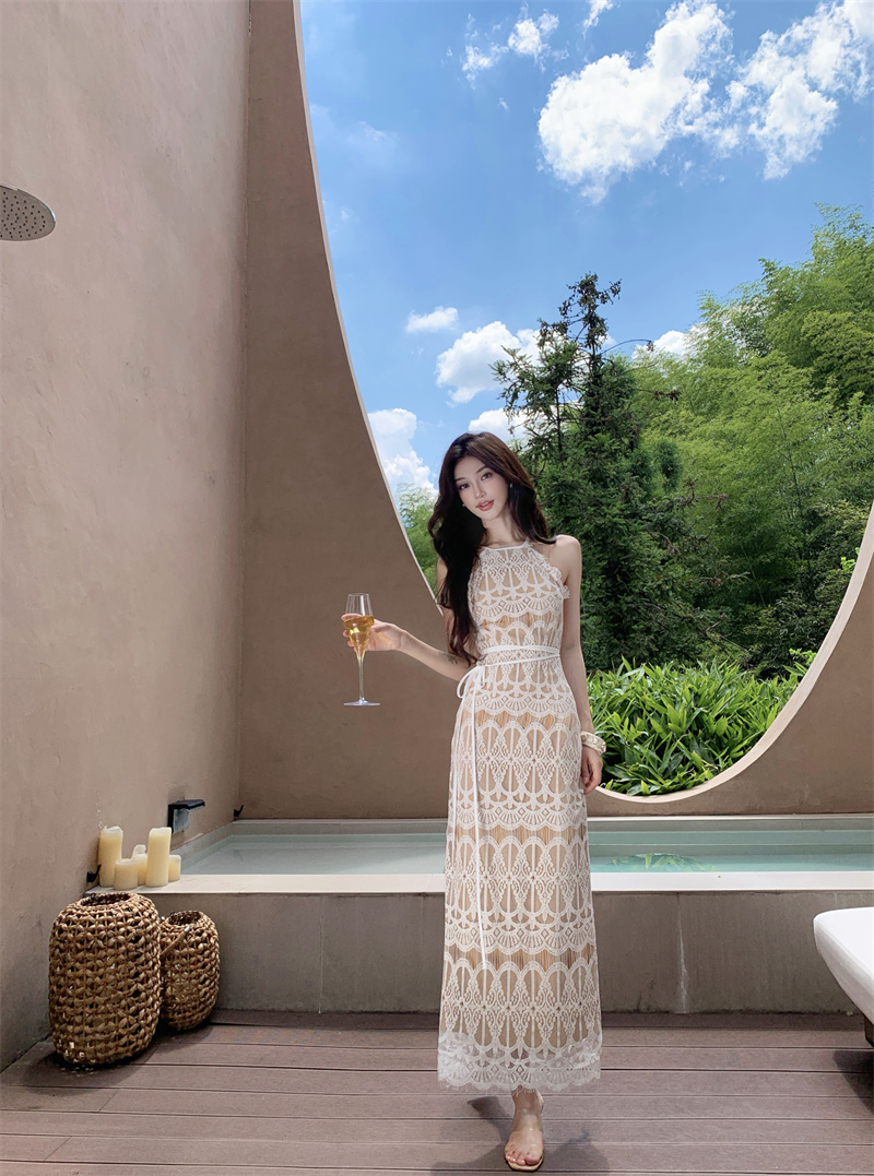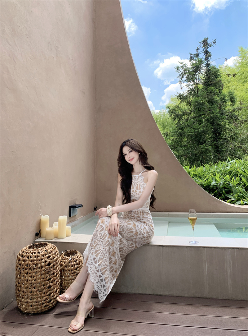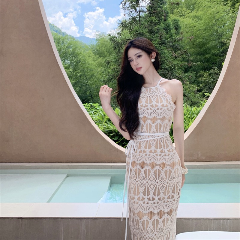 레이스 조각 민소매 행침 목 여성 드레스 여름 트임 허리 수축 인어 꼬리 치마 순수한 욕망 몸매 가꾸기 타이트 스커트 롱 스커트