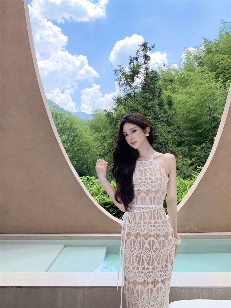 onmoon 여름 백리스 홀로우 아웃 허리 수축 민소매 드레스 2025 새로운 가스 몸매 가꾸기 한 마디 빅 플레어 스커트 여성
