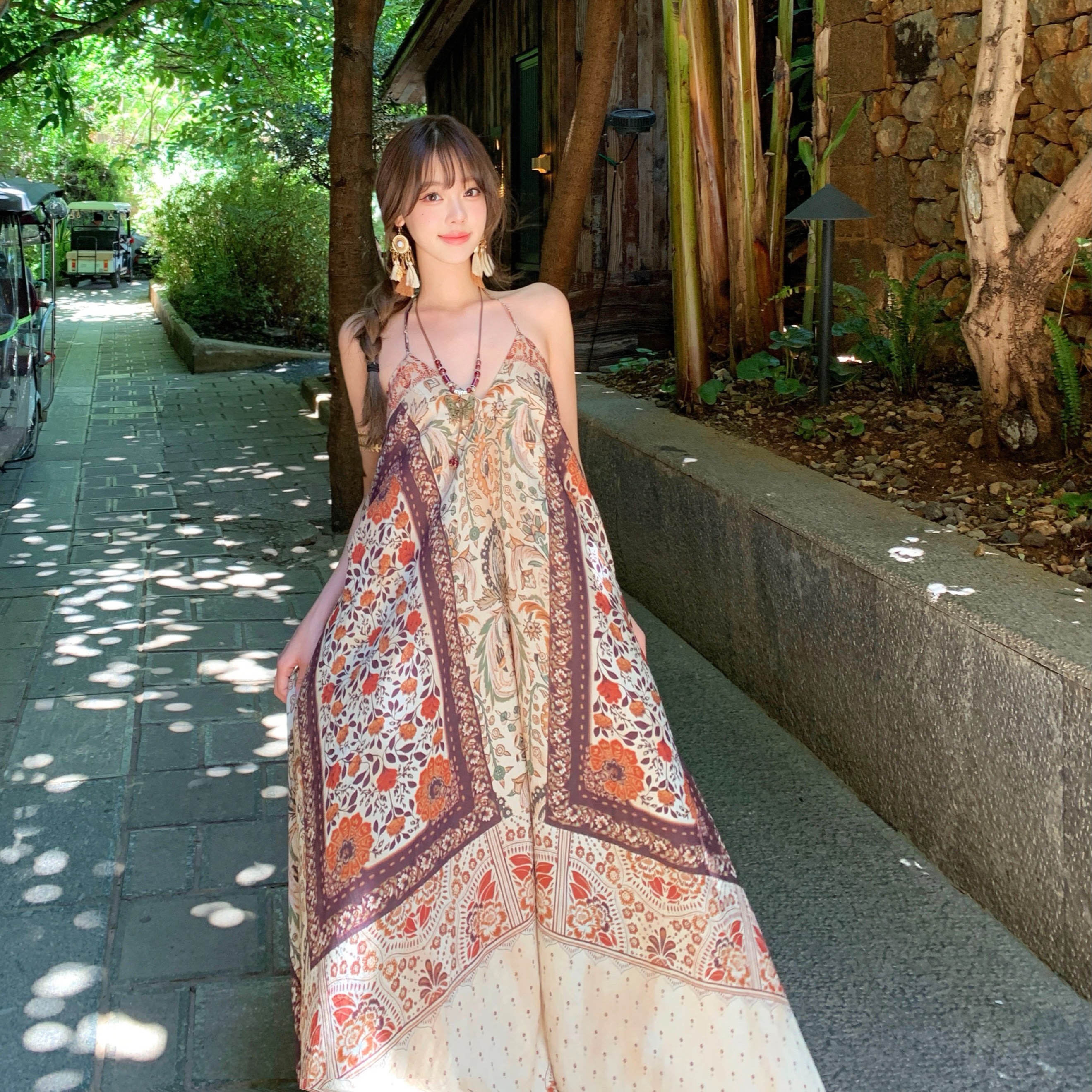 프랑스식 홀치기 염색 헤일로 염색 프린트 슬립 드레스 2025 여름 새로운 허리 수축 슬림해 보이는 핫걸 롱 스커트