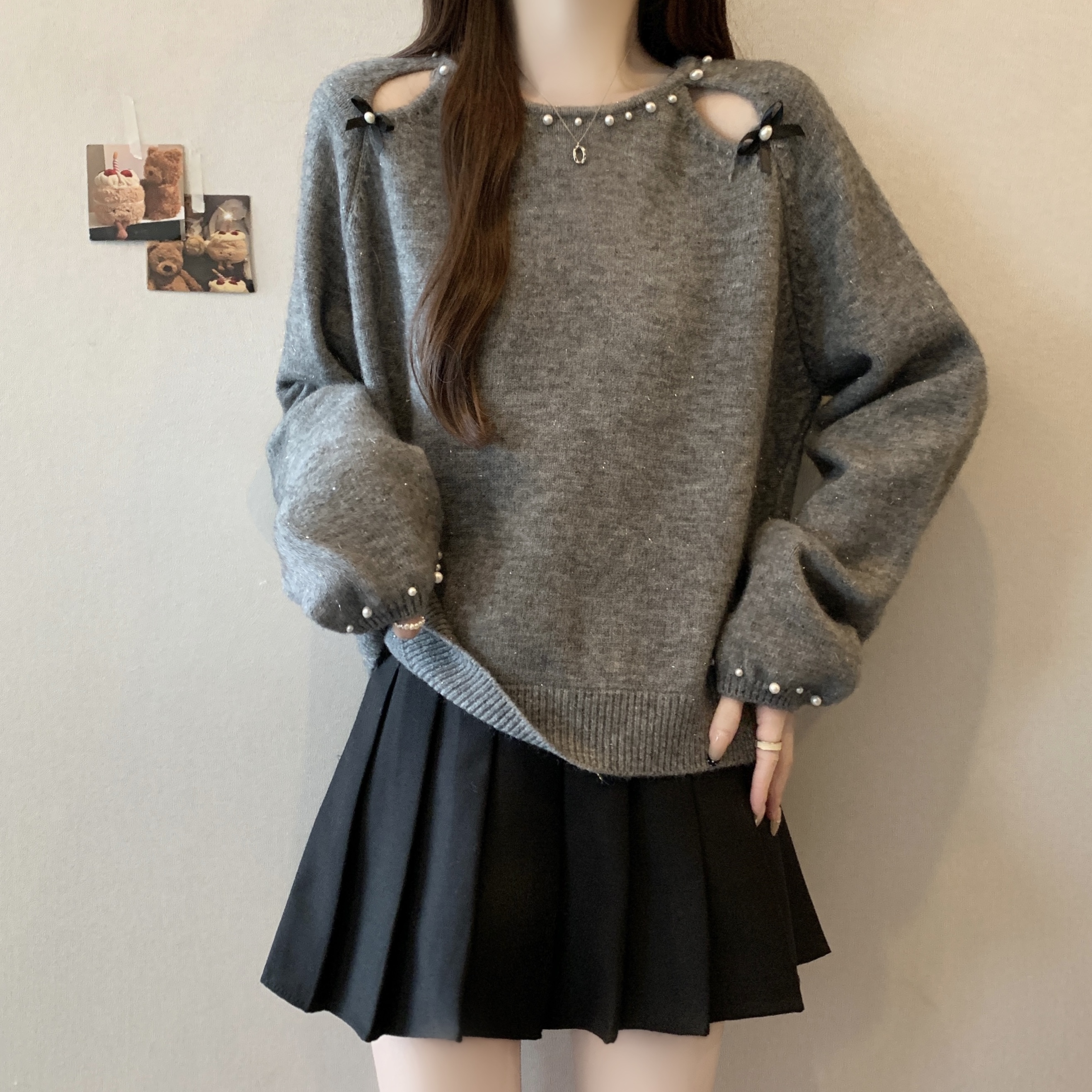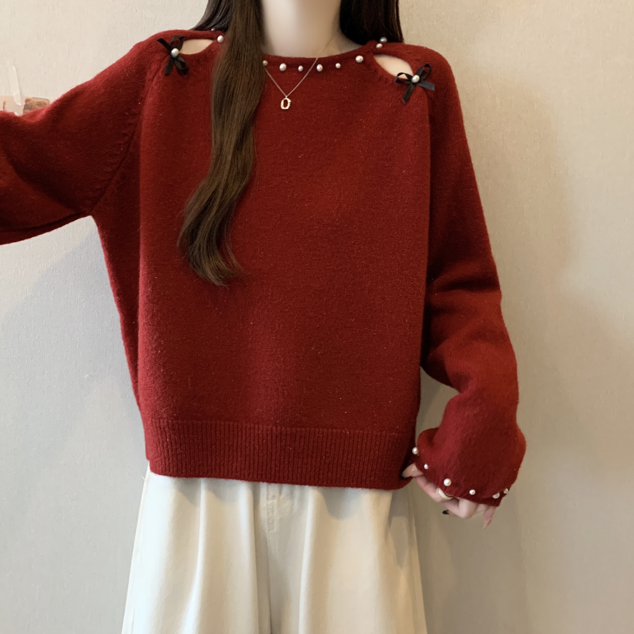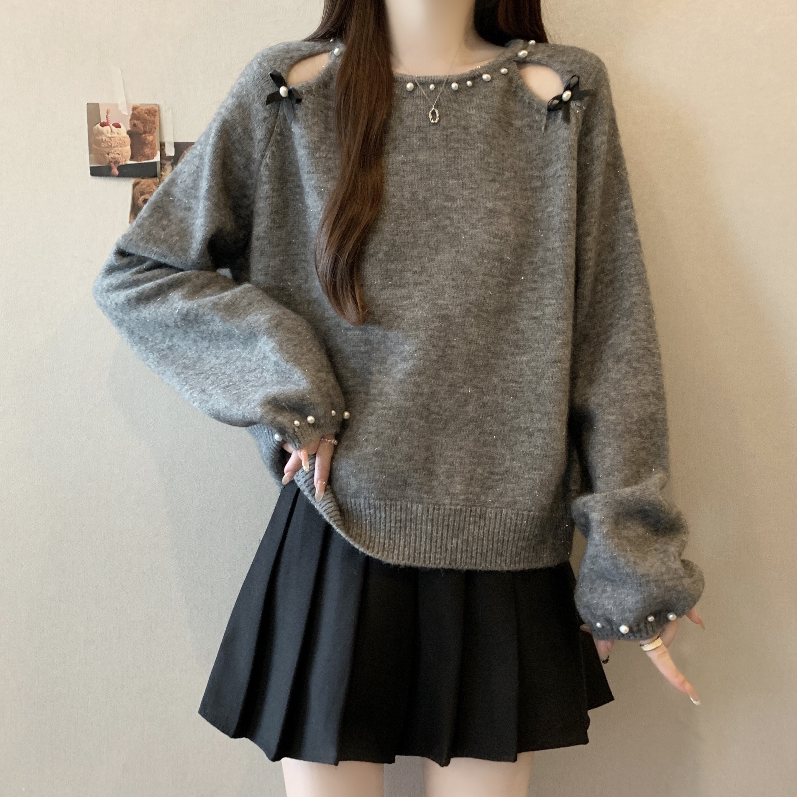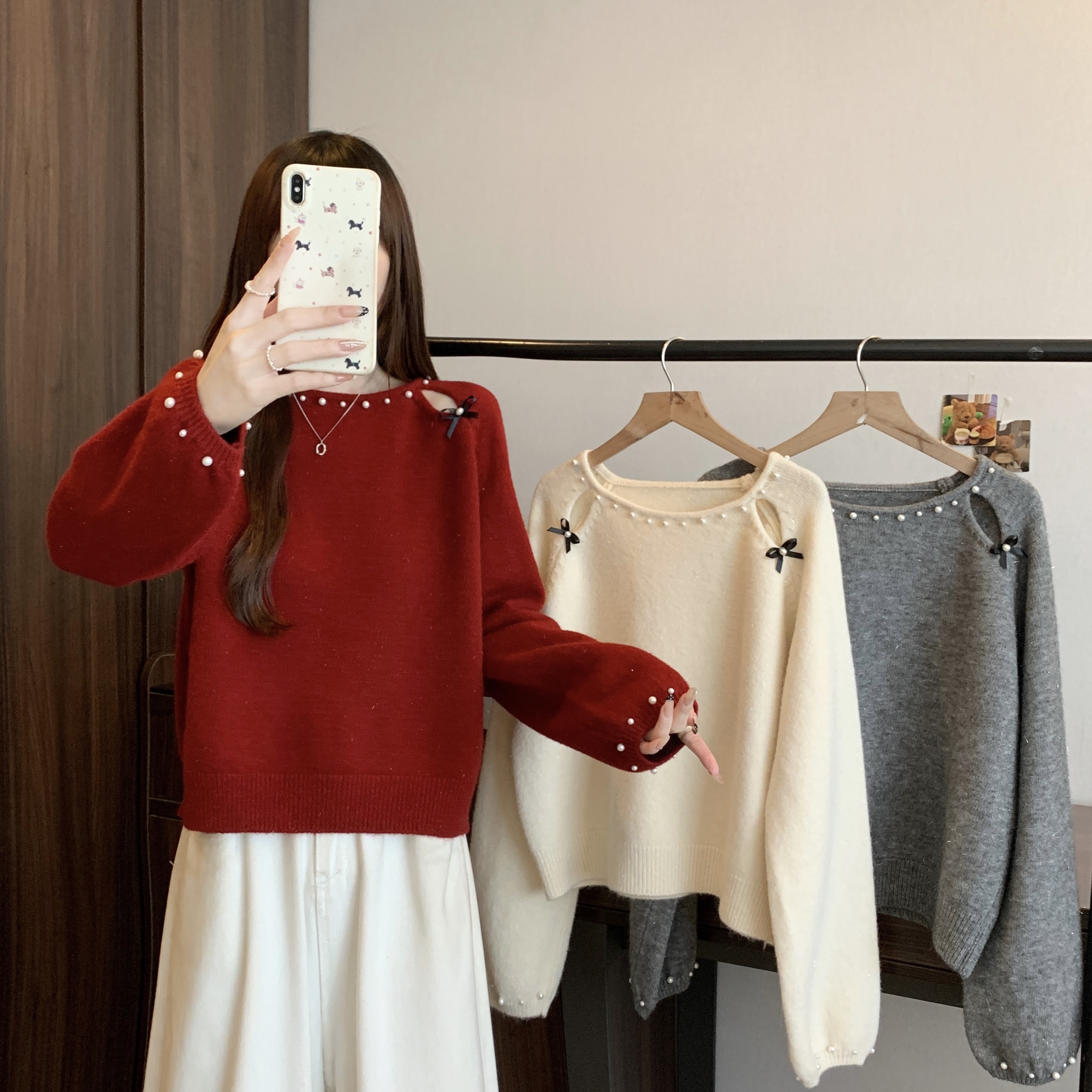 실사 빅 사이즈 단색 배트윙 소매 풀오버 스웨터 여자 가을 겨울 루즈핏 보트넥 느긋한 바람이 아닙니다. 규칙 맨위