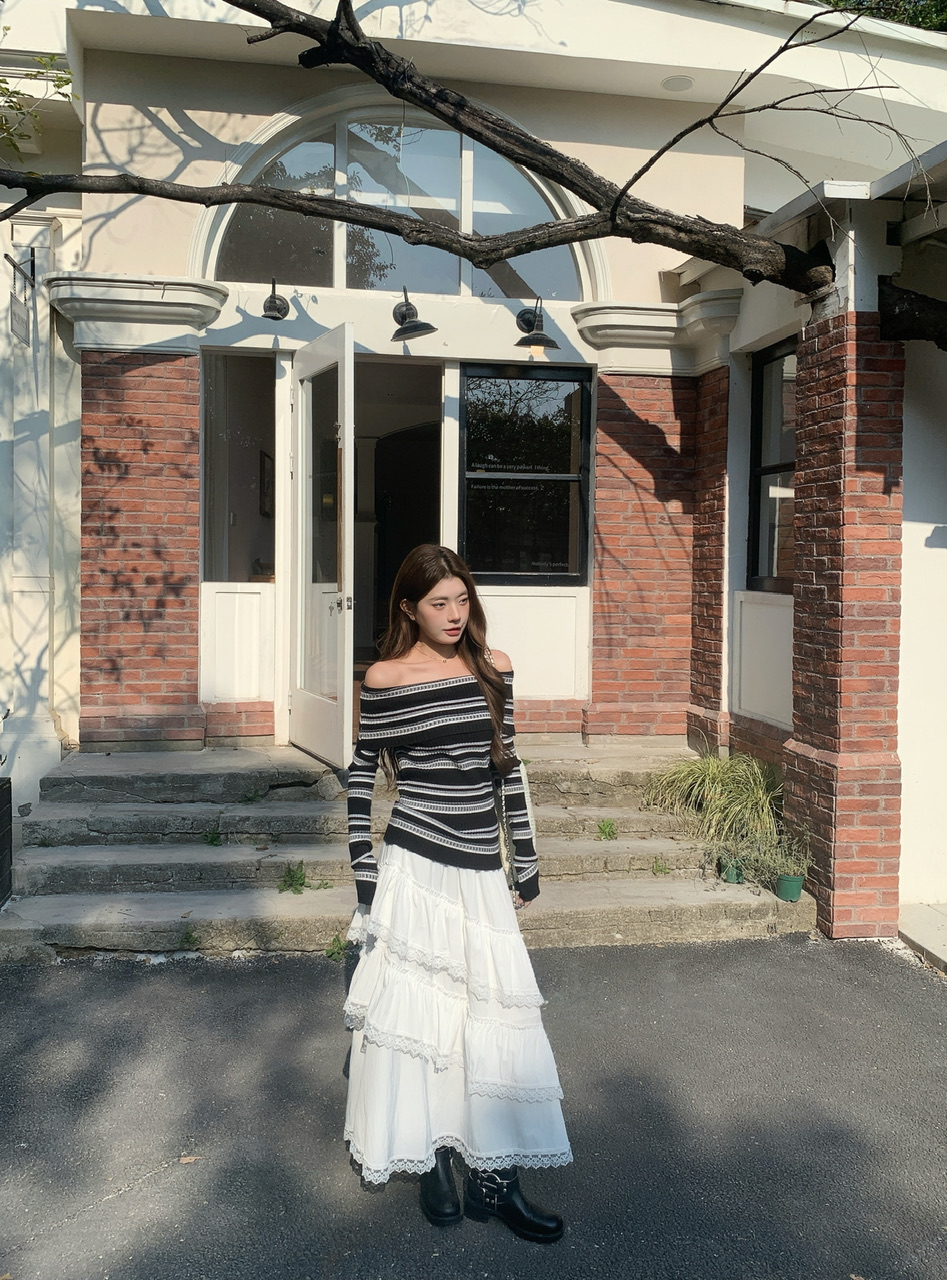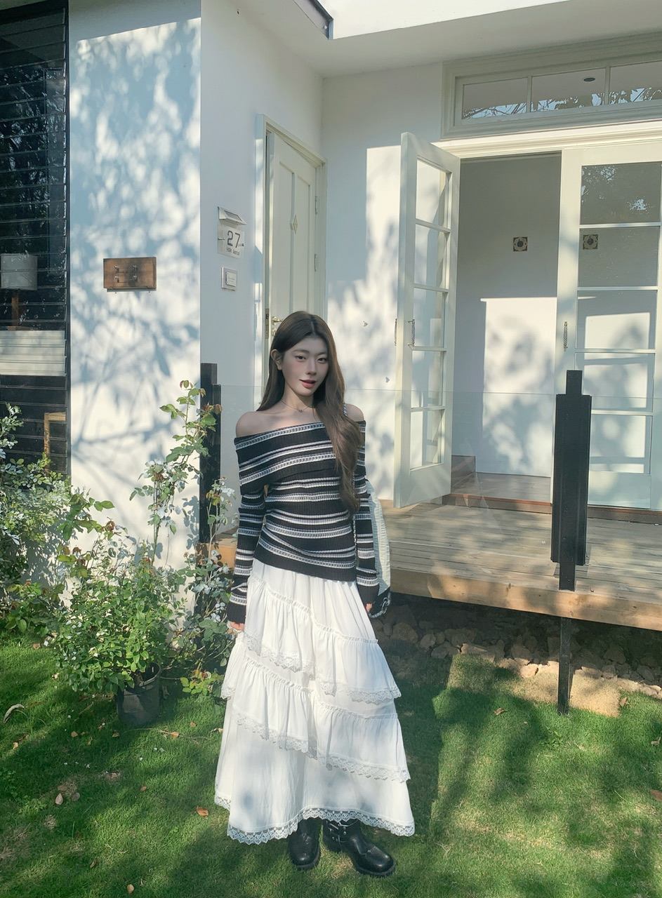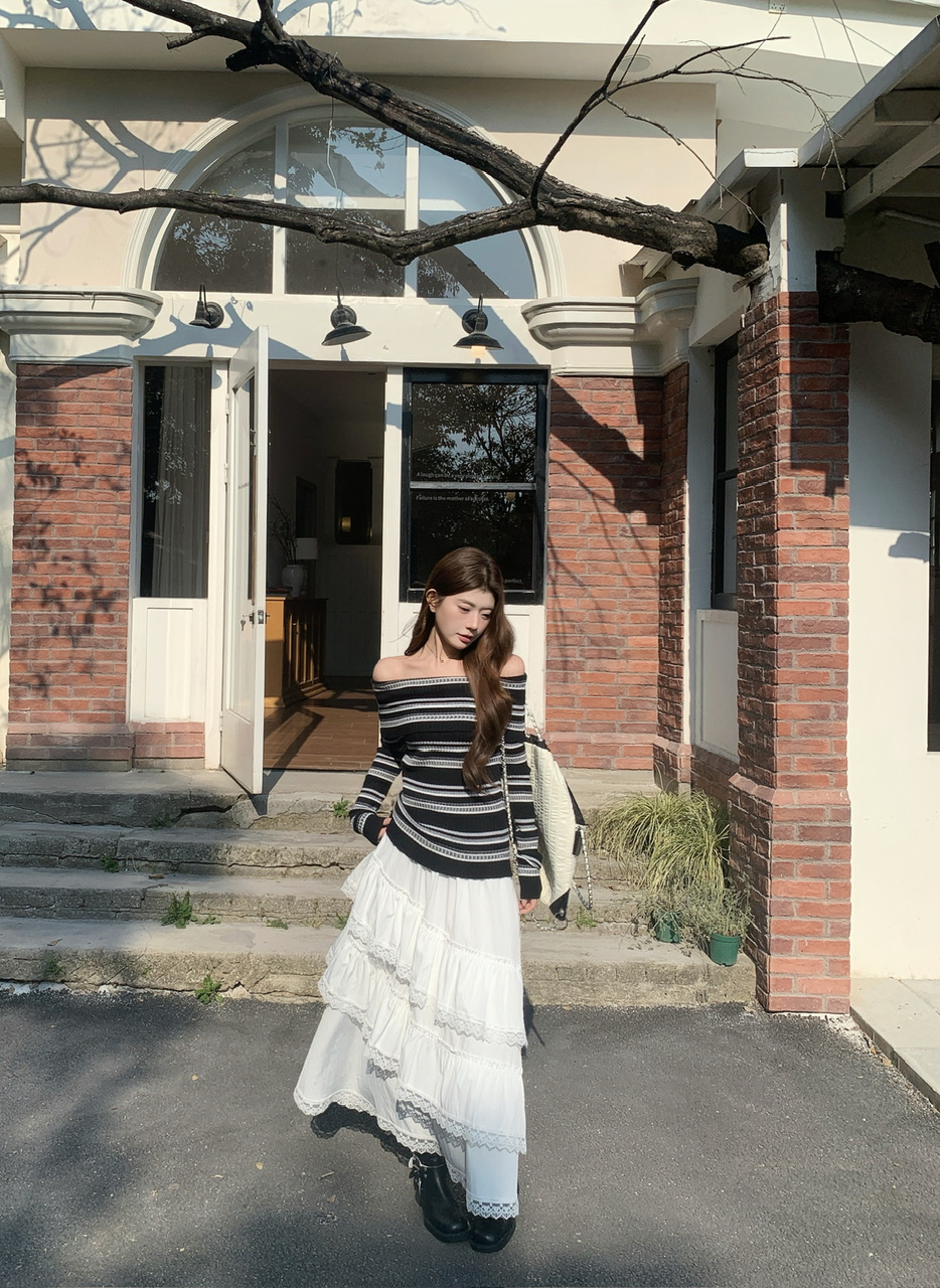 정가 실사 달콤한 차가운 오프숄더 스트라이프 니트 스웨터 쌀 화이트 망사 케이크 드레스 봄 부드러운 바람 투피스 세트