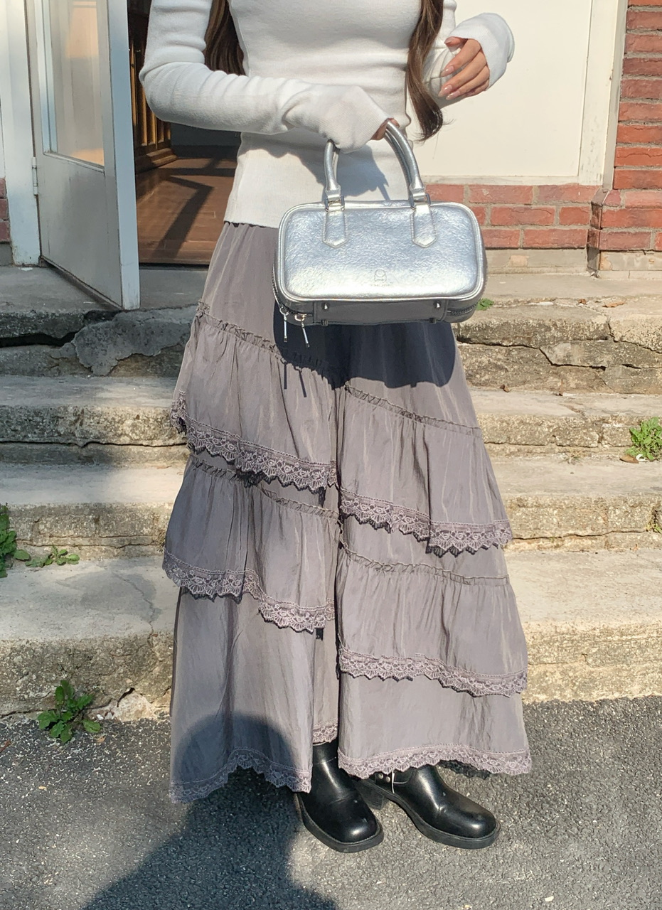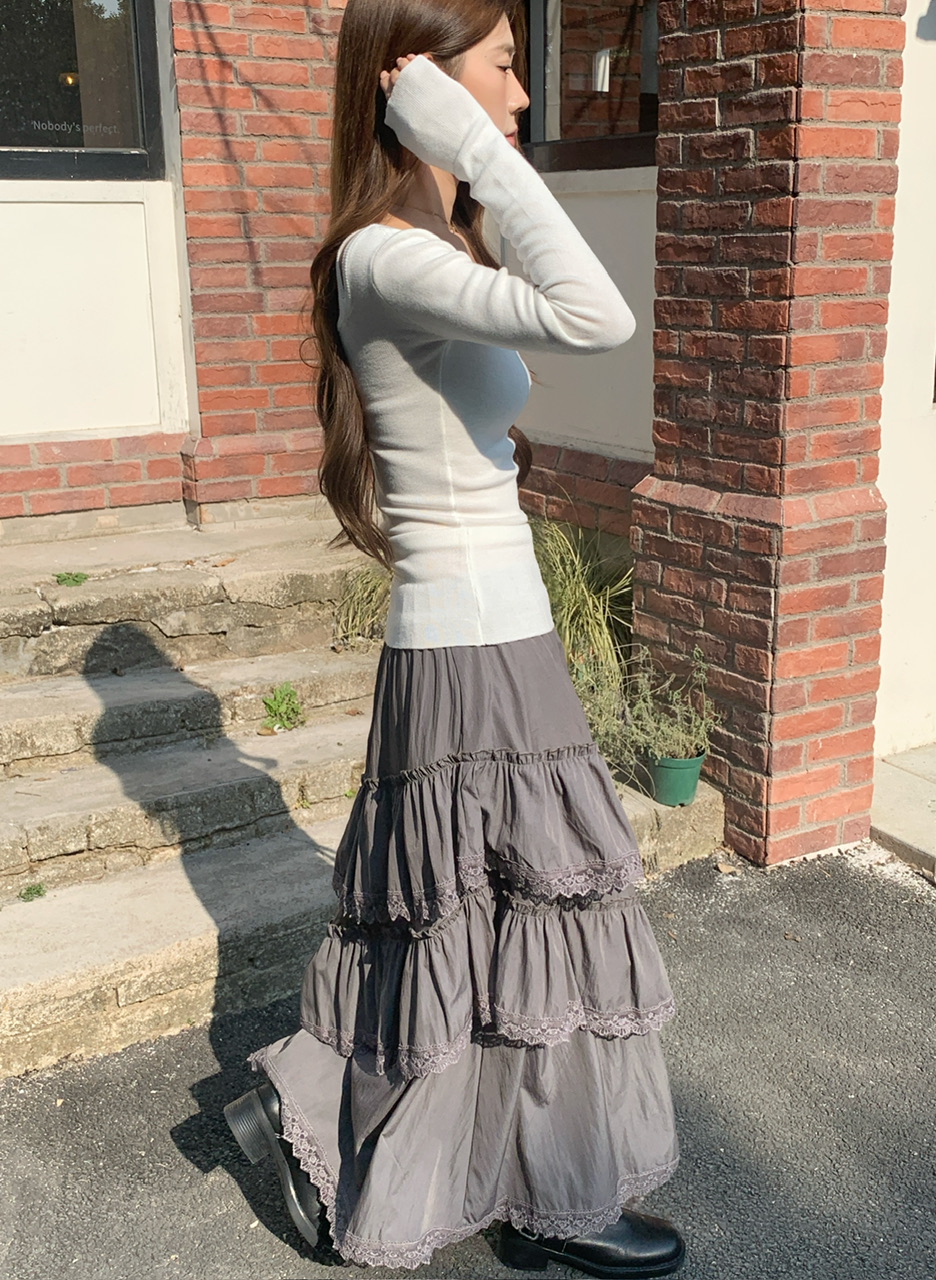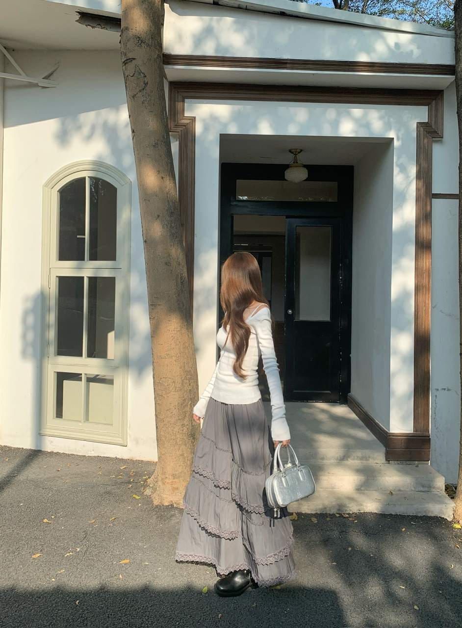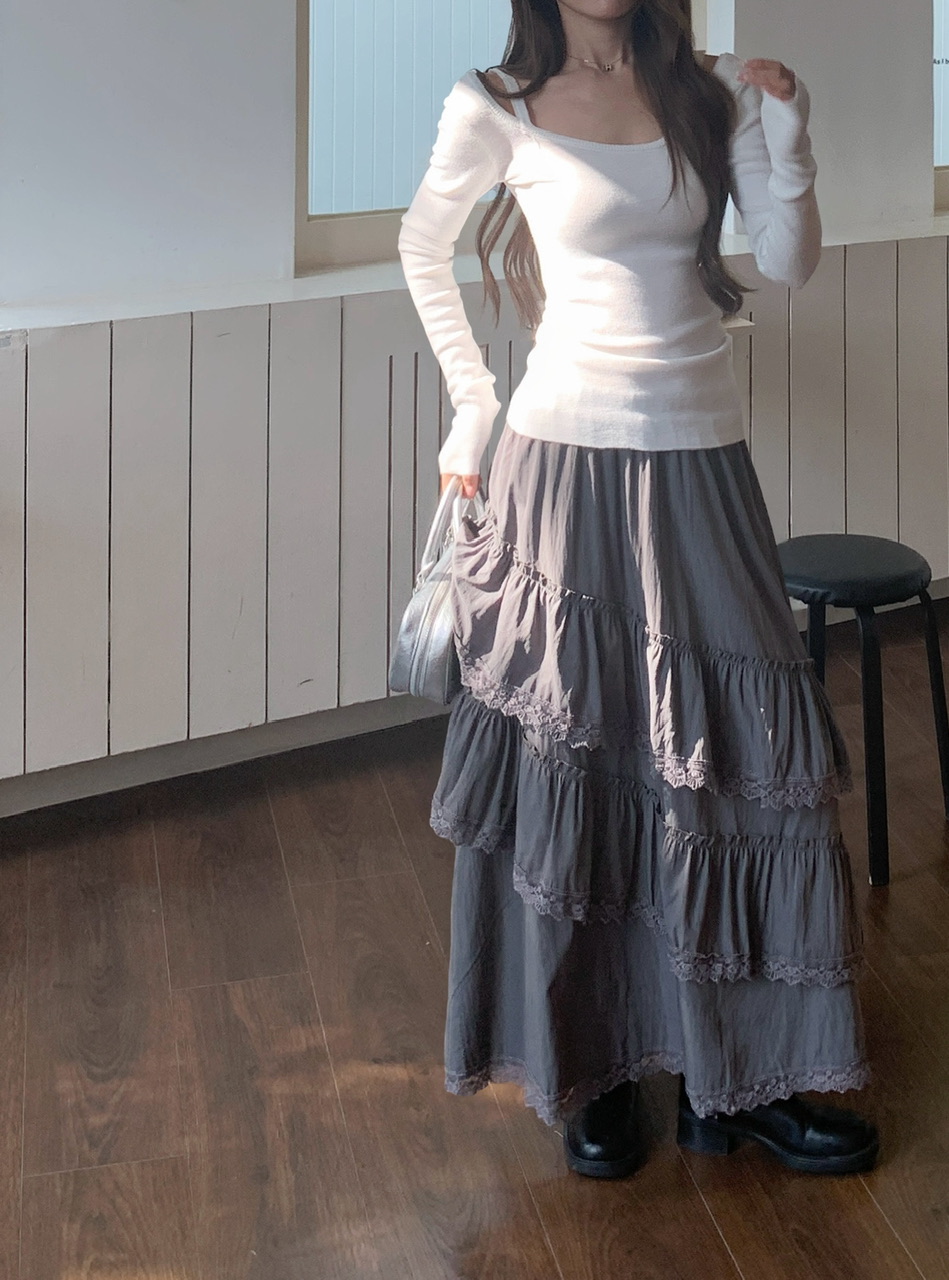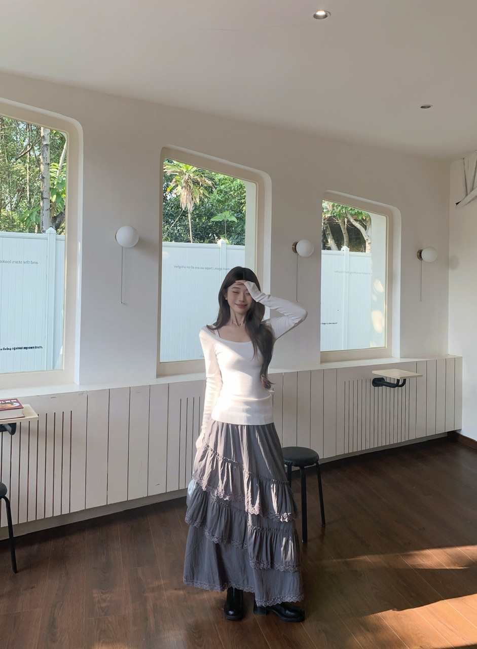 정가 실사 느긋한 몸매 가꾸기 대 u 칼라 기본 셔츠 하이웨이스트 슬림해 보이는 회색 보라색 프릴 반신 롱 스커트