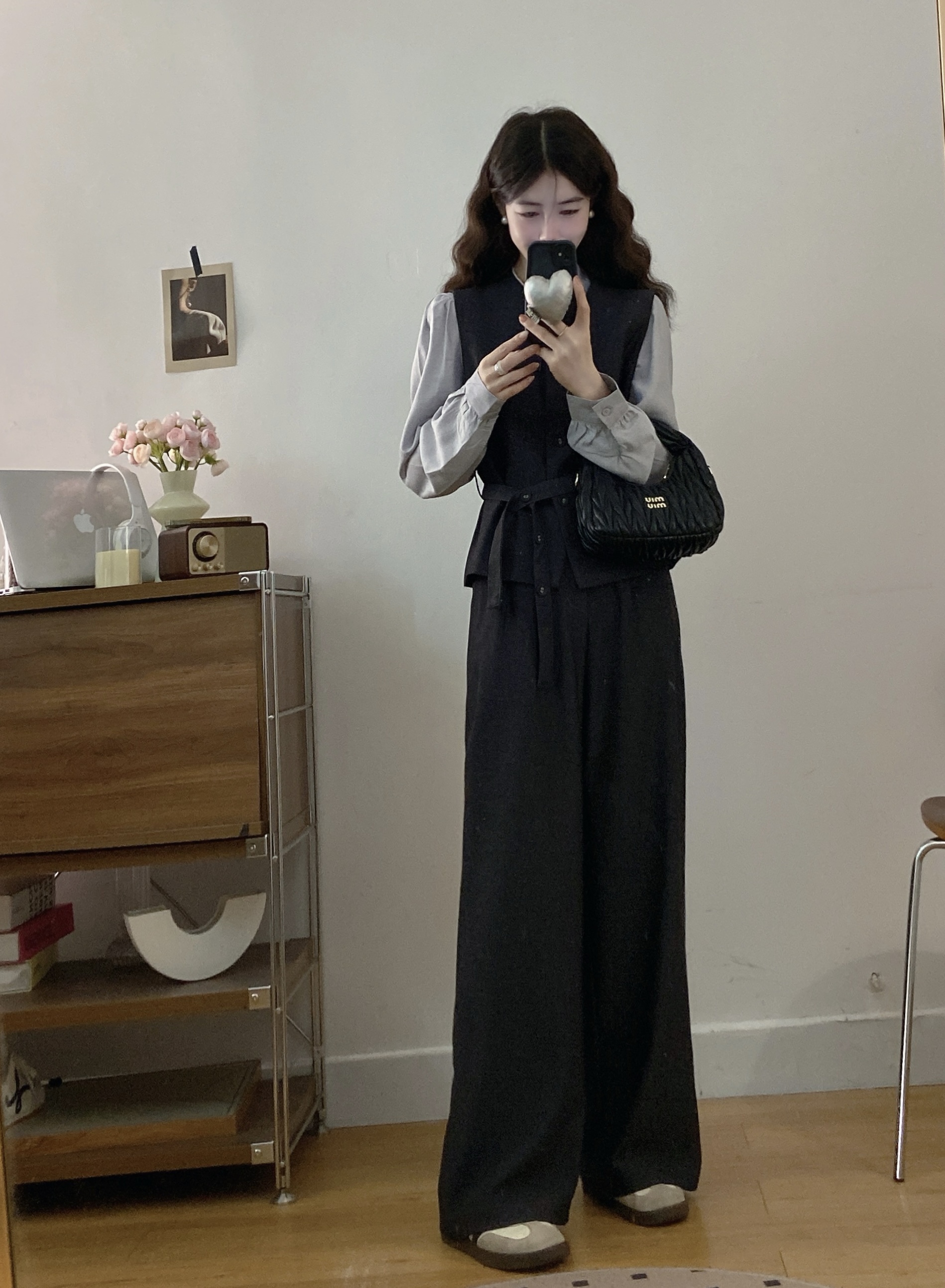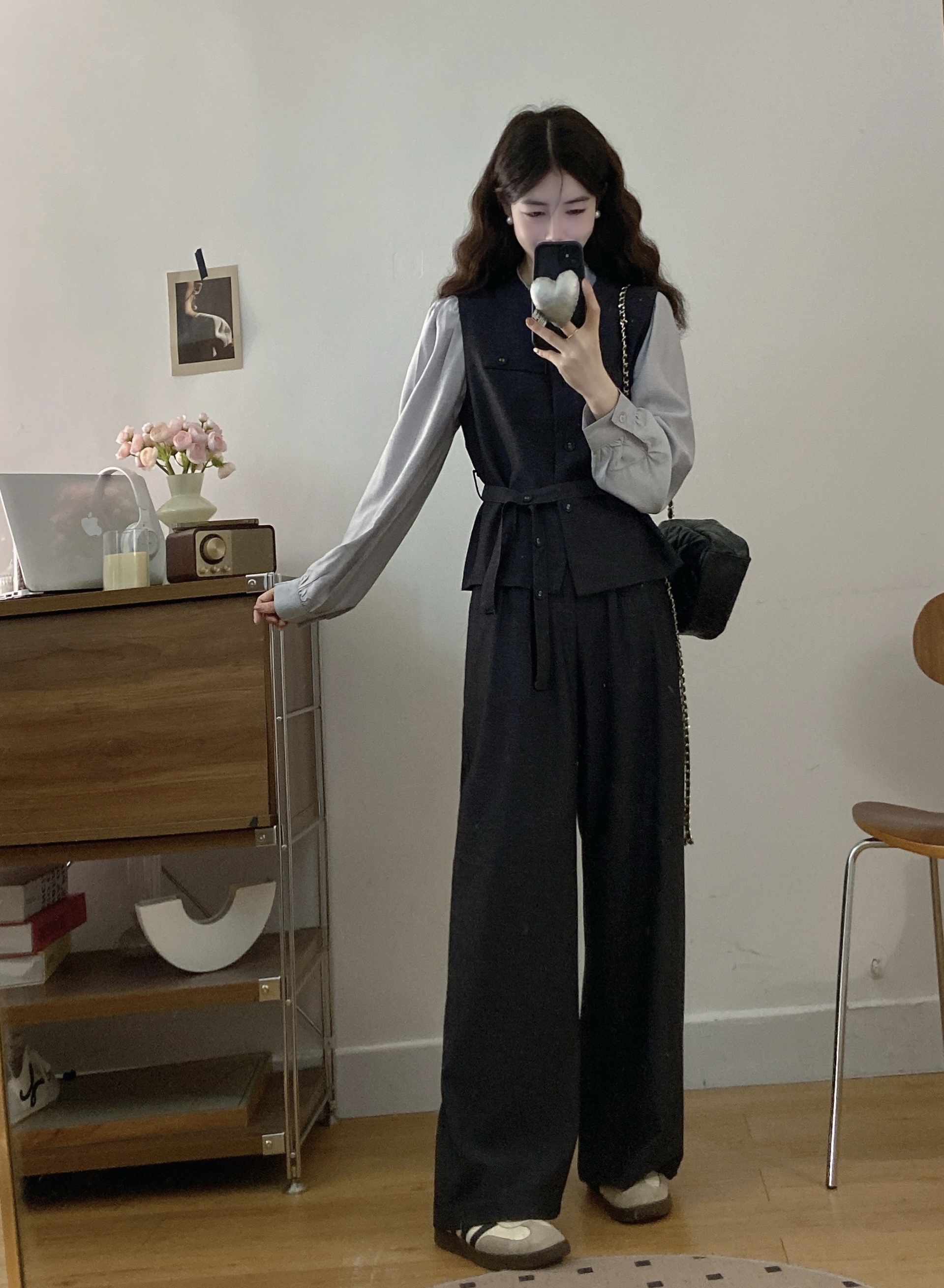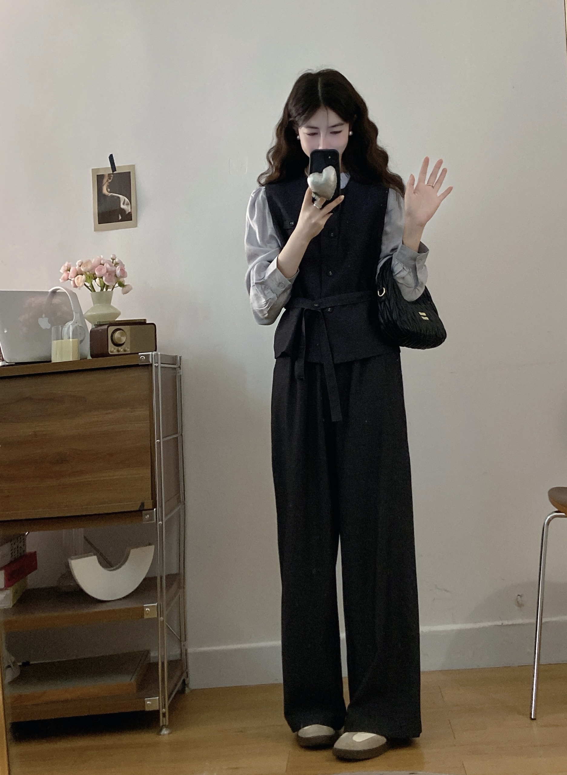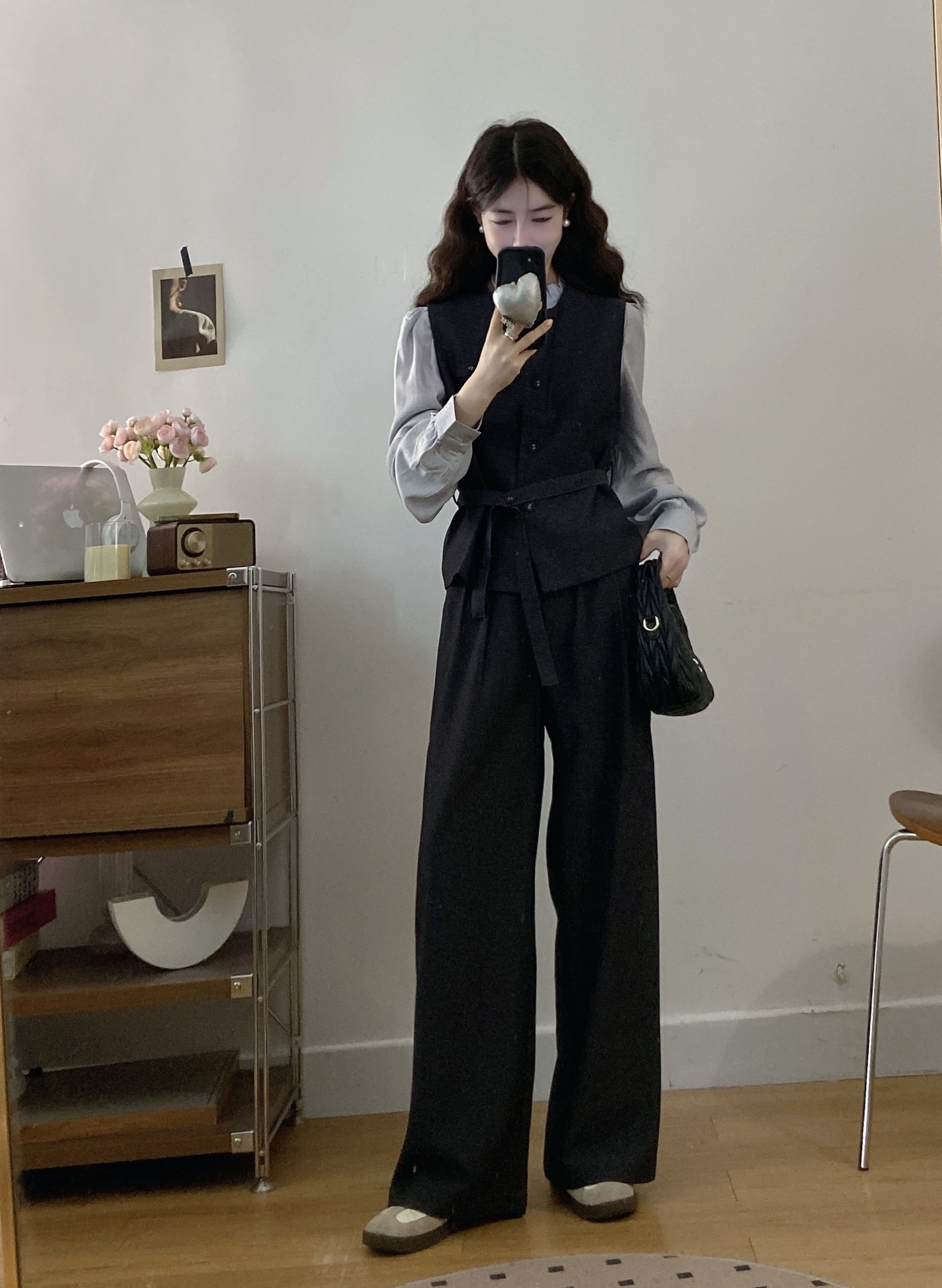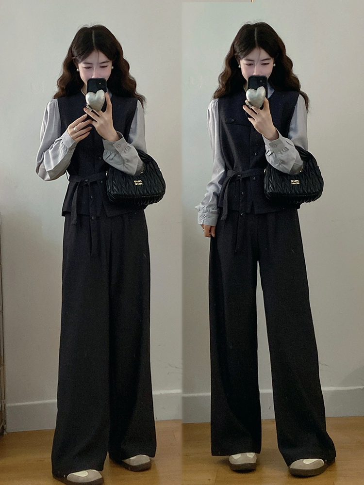 실사 빅 사이즈 여성 의류 2026 봄 새로운 한국 스타일 고급 센스 베스트 셔츠 와이드 레그 팬츠 3종 세트