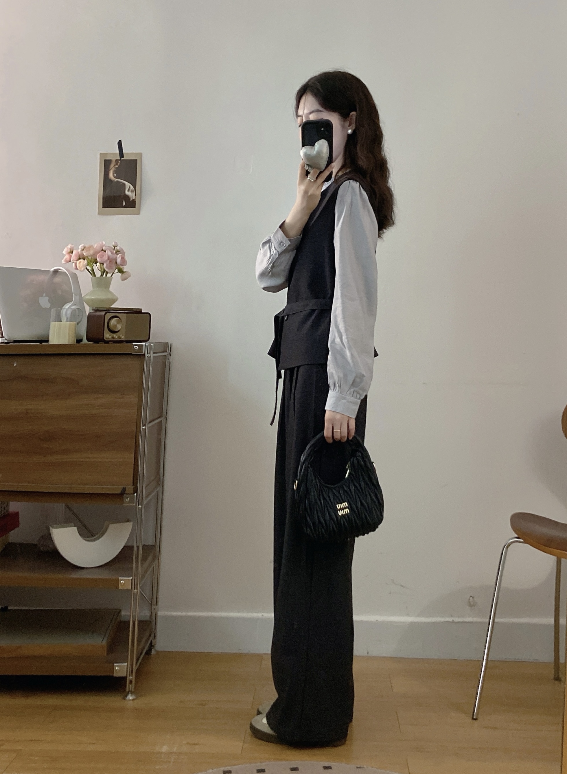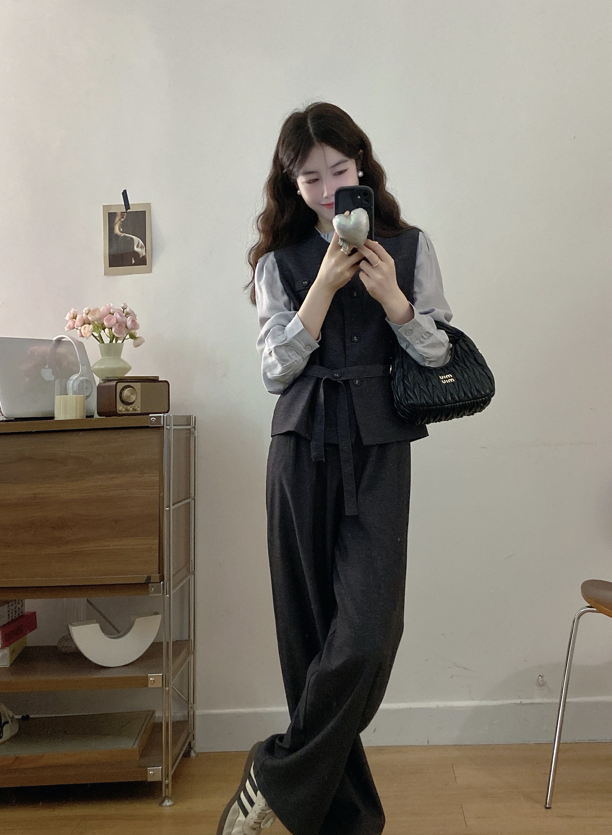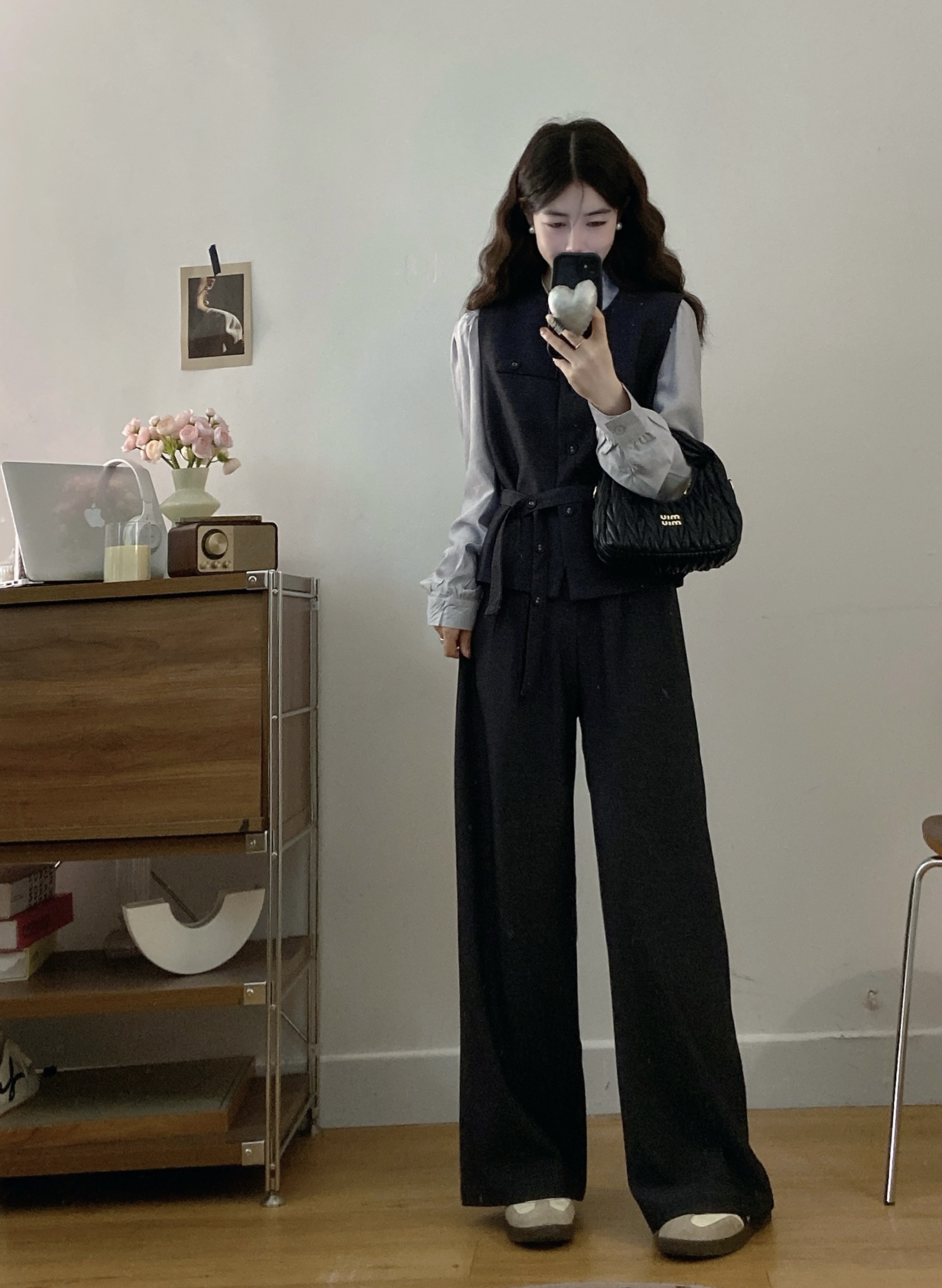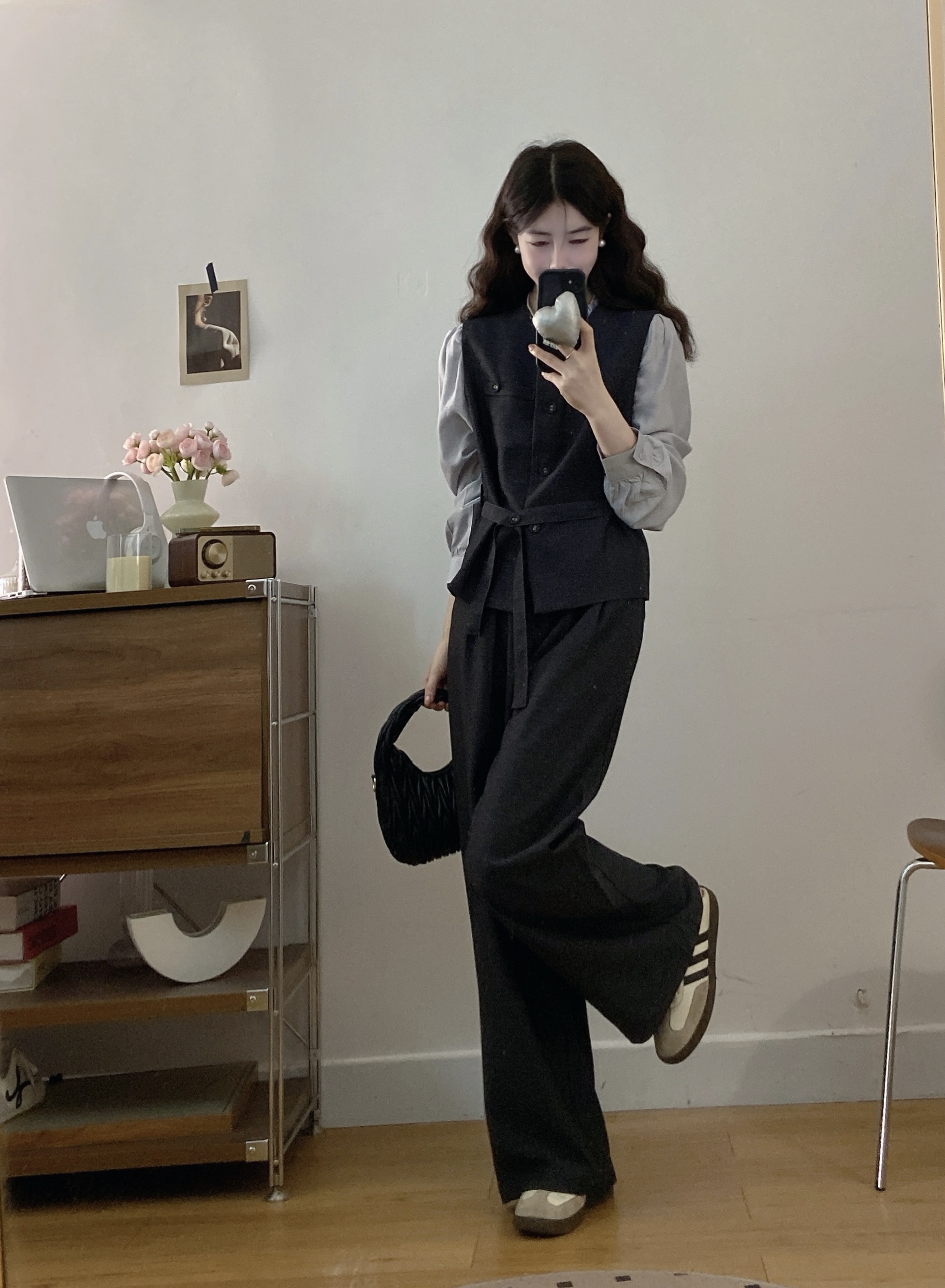 실사 빅 사이즈 여성 의류 2026 봄 새로운 한국 스타일 고급 센스 베스트 셔츠 와이드 레그 팬츠 3종 세트